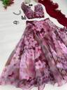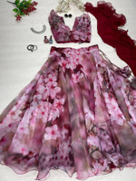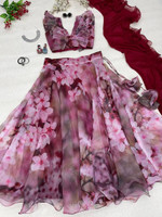 Featuring a delicate floral print pattern, this women’s lehenga, choli, and dupatta set showcases a timeless design that adds charm to any occasion. The intricate floral detailing is complemented by the playful frills, enhancing this outfit's overall appeal, and creating a look that is both elegant and lively. Whether for festive gatherings or celebratory events, this set adds a touch of tradition with a modern aesthetic.