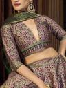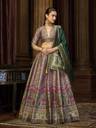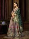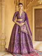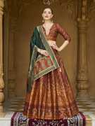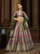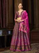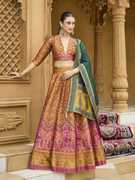Step into timeless elegance with this exquisite Kanjivaram lehenga choli, crafted in a rich double-tone shine that radiates luxury. Adorned with intricate zari work featuring blooming floral and traditional paisley motifs, it captures the essence of heritage artistry. The look is elevated with a striking contrast dupatta, detailed with a lustrous zari border and playful tassels for added charm. A perfect choice for festive occasions and wedding celebrations, this ensemble blends classic tradition with regal grandeur.