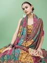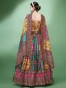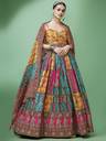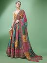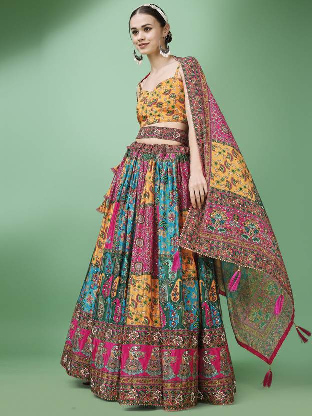 Elevate your ethnic wardrobe with our printed lehenga choli, a masterpiece designed to make you shine. Crafted from bright chinoon fabric, the lehenga boasts a vibrant canvas that captures attention from every angle. The gathered flare hemline creates a mesmerizing silhouette, swaying gracefully with each step you take. Intricate sequence work adorns the ensemble, adding a touch of sparkle and opulence that's perfect for celebratory occasions. With its fusion of striking design and rich detailing, this lehenga choli ensures you're the embodiment of elegance and grace at any event.
