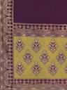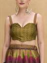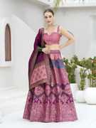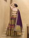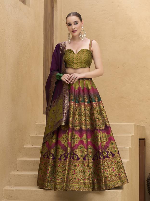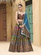 Drape yourself in timeless elegance with this exquisite Kanjivaram lehenga choli set, crafted to perfection with luxurious zari embellishments and a double-tone shimmering finish. The lehenga is adorned with unique ethnic motifs highlighted with delicate shading effects, bringing depth and artistry to every detail. A beautifully balanced color palette enhances its regal charm, while the contrast dupatta featuring a rich zari border and playful tassel details completes the ensemble. Perfect for festivals and wedding celebrations, this outfit exudes grace, grandeur, and tradition with a modern touch.