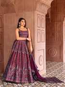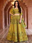 A Kanjivaram lehenga with zari is a luxurious traditional garment that combines the richness of Kanjivaram silk with the intricate detailing of zari work. The lehenga is typically made from Kanjivaram silk, known for its durability, lustrous sheen, and intricate patterns.The fabric is often in vibrant colors and rich golds. The zari work, which is a type of metallic thread, is woven into the fabric, creating elaborate designs. The lehenga might also feature a broad border with heavy zari work, giving it a grand, opulent look. Paired with a matching or contrasting blouse and a dupatta, often with complementary zari detailing, the overall ensemble exudes elegance and tradition, making it perfect for weddings, festivals, and other grand occasions.