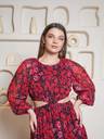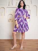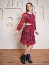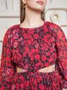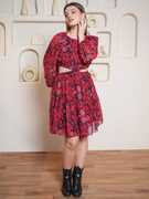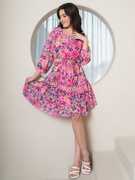 Turn heads in this effortlessly chic fit-and-flare mini dress crafted from breezy georgette fabric. With a playful cut-out waistline, this dress creates an alluring silhouette while still feeling comfortable. The ruched V-neckline adds a touch of romance, perfectly complemented by the long puff sleeves that bring a hint of drama. The lively printed pattern enhances the dress's feminine charm, making it a versatile piece for both day outings and evening events.