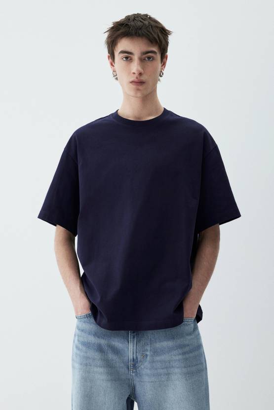 Q-CUT Solid Men Round Neck Navy Blue T-Shirt