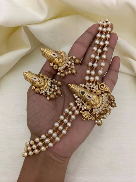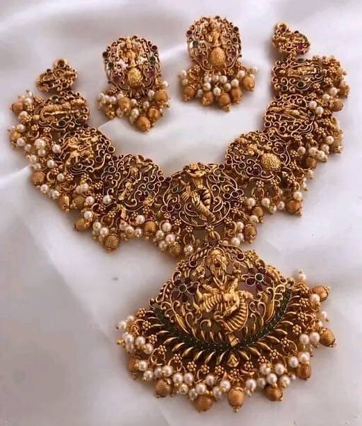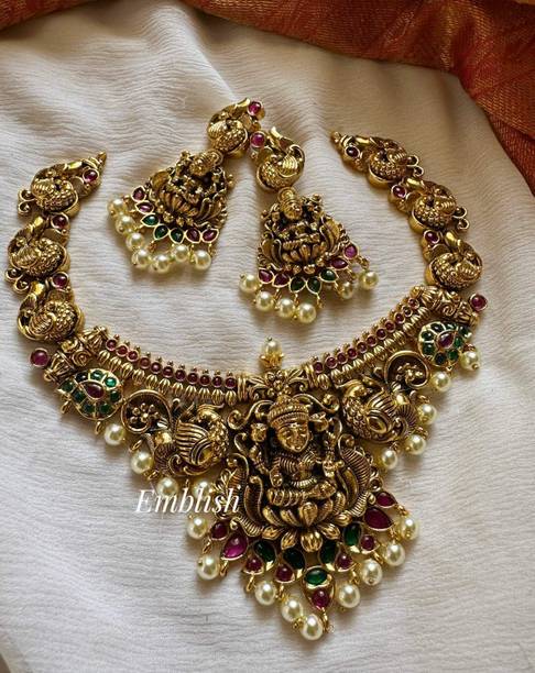 There are a number of styles under which the vintage/ antique style ornaments were made. Kundan jewellery is one such form that is often associated with the antique style. Kundan is a traditional form of Indian gemstone jewelry which has a gem set and a gold foil between the stones and the mount. Under this style there are a lot of elaborate necklaces that are available online. Brands like Sukkhi, Zaveri pearls, The Jewel box and the like make kundan jewels with great designs. Artificial temple jewelry is another antique form. These are primarily identified by very heavy design work and these will be decorated with shapes of Hindu Gods and Goddesses like Goddess Lakshmi, Ganesha, Krishna, Goddess Saraswati and the like. These are worn mainly during traditional functions like weddings, poojas, festivities like Diwali, Karthika and more. These are also used by traditional classical dancers like Bharatanatyam and Mohiniyattam dancers for their performance.