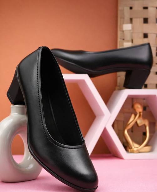 The kitten heels are the shortest heels you can get. They range from 1.5 to 2 inches. Their short height makes them very comfortable and easy to wear for longer periods. Black heels of this style have small, slender heels with a slight inward curve. These kitten heels are often called ‘trainer heels’ since they’re easy for beginners to wear till they adjust to wearing high heels. Kitten heels are elegant and feminine while still being professional enough for the workplace or everyday wear. The Do Bhai Women Black Heels and the Vendoz Women Black Heels are great options for a pair of wearable kitten heels.