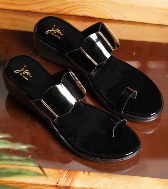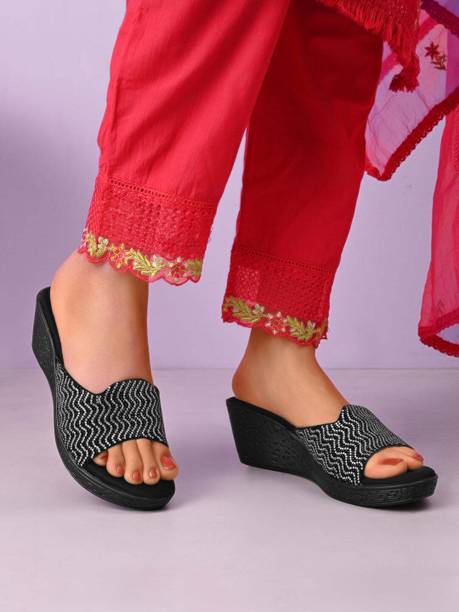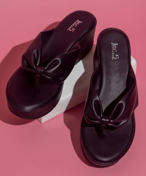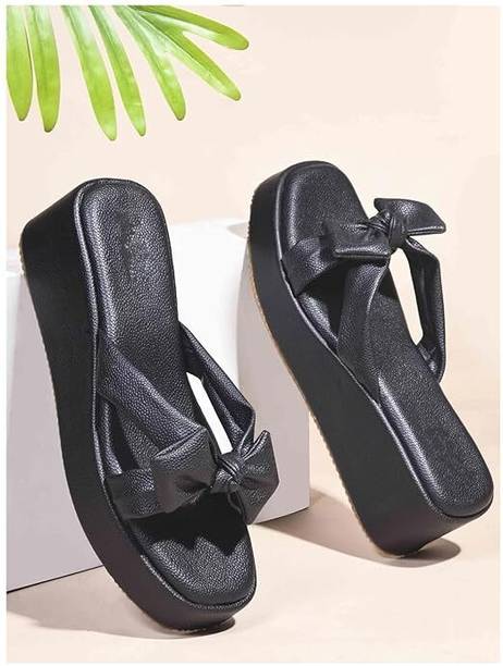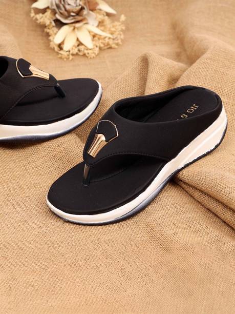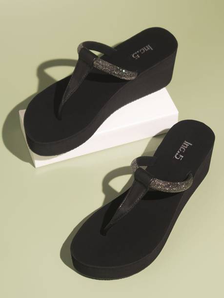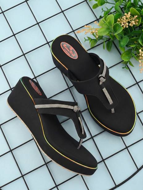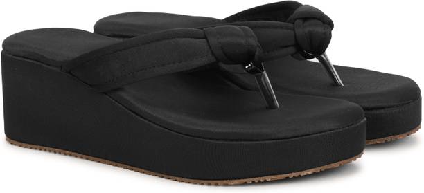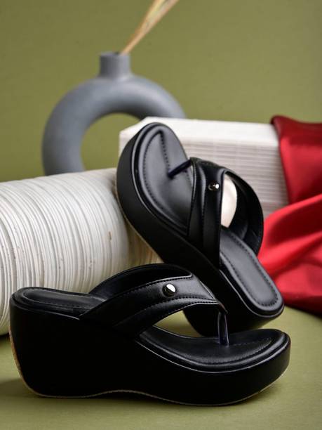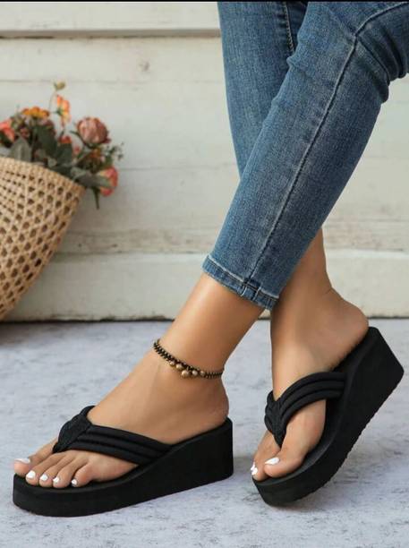 3. Opt for thong-style wedges to get the comfort of flip flops or chappals. You can comfortably and stylishly sport these wedges to the beach or your country club’s swimming pool. You can wear a black crop top and white denim pants for this occasion.