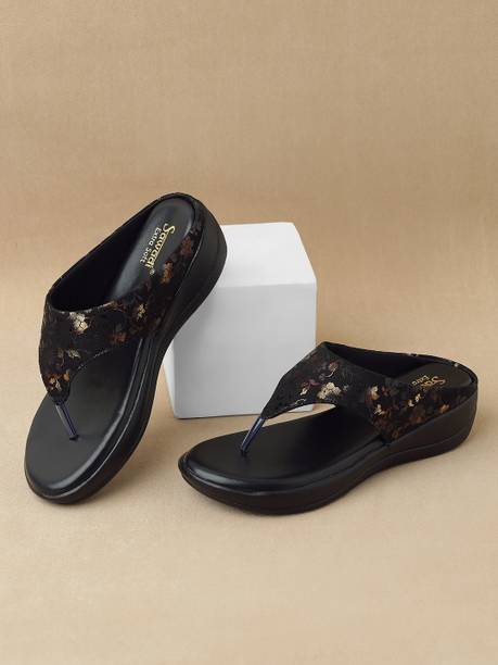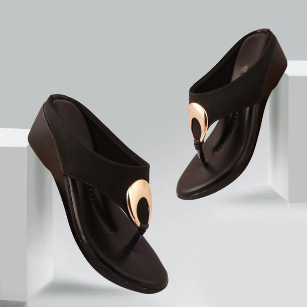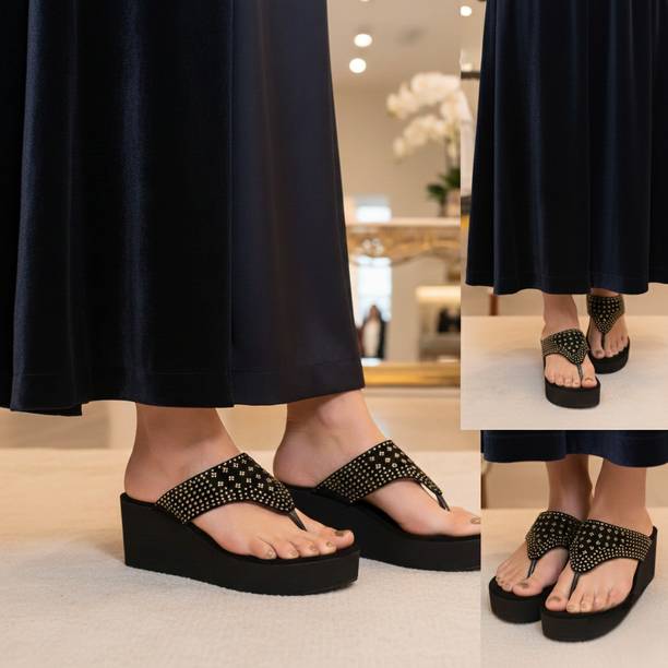 3. Opt for thong-style wedges to get the comfort of flip flops or chappals. You can comfortably and stylishly sport these wedges to the beach or your country club’s swimming pool. You can wear a black crop top and white denim pants for this occasion.