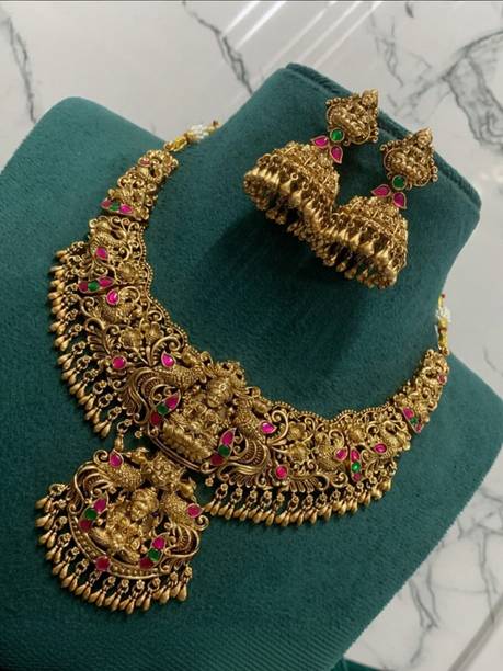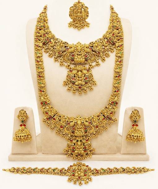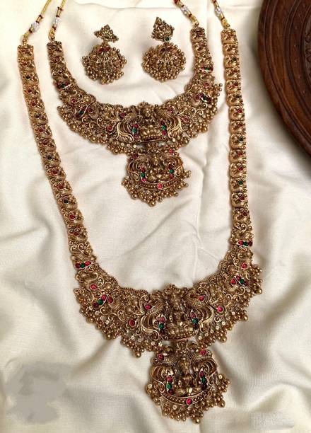Temple Jewellery - Temple jewellery brings out a sort of exquisite and divine look from the bride. Layered in beads, stones and gold foils, temple jewellery will definitely give the bride a million dollar appearance on her grand day. The goddess pendants and necklaces are usually studded with pearls and stones, giving the jewellery a heavy look. Chandrika, Abhushan, and Multiline Jewellery have a wide collection of temple jewellery for you to choose from.