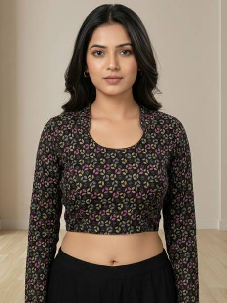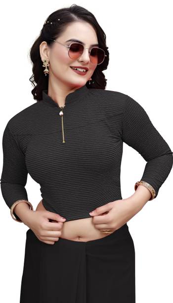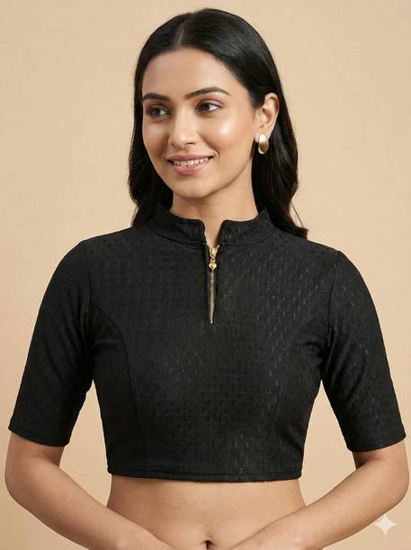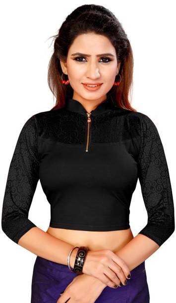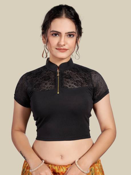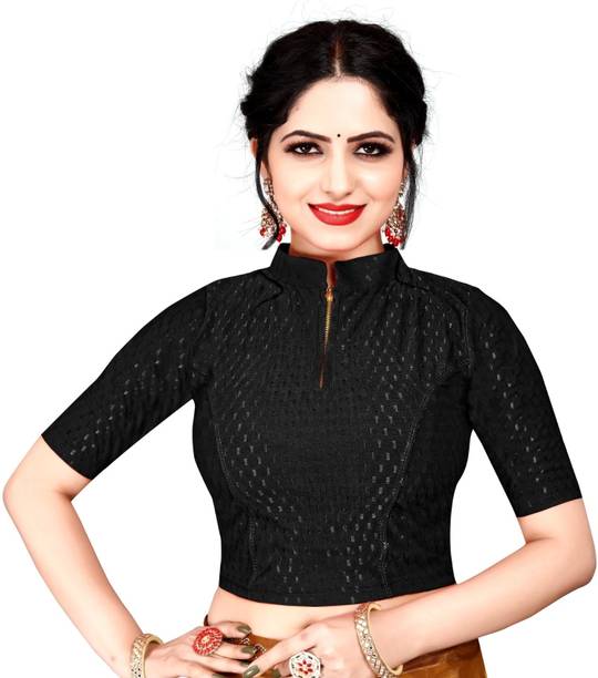 Invest in a stitched black cotton hosiery stretchable blouse designed with net cap sleeves and a fashionable peter pan collar. This versatile piece will instantly add style to your ethnic attire. Accessorize with hoop earrings, bracelet cuffs and a pair of block heels to look simply gorgeous.
