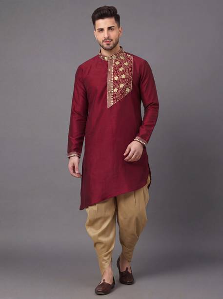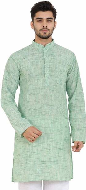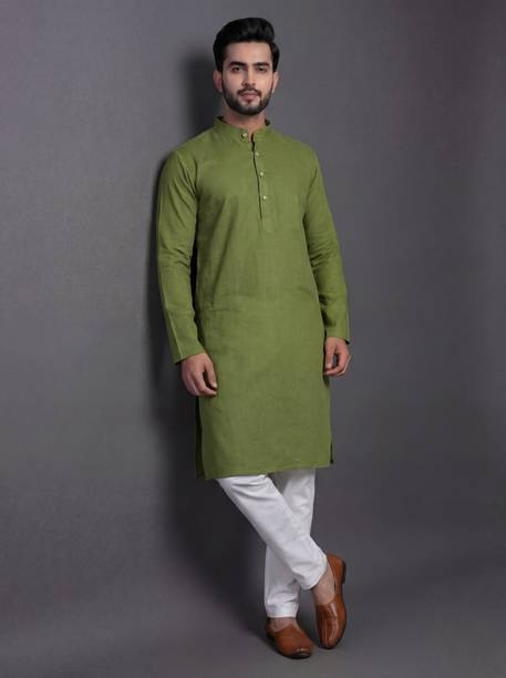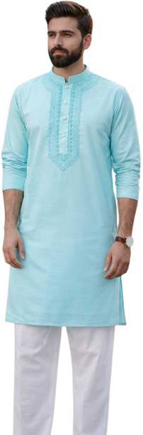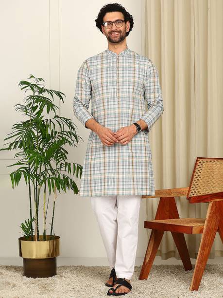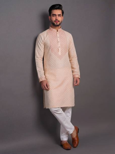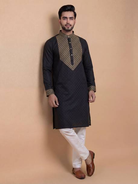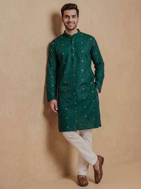 Cotton kurta pyjama for men is a set that every man needs in the hot and sultry weather. The chic look of this attire can make you selfie-ready in no time. The men's garment is available in various sizes to meet your requirements. The cotton kurta set comes in varying styling combinations like blazer, layered, kaftan, shirt, top with a jacket, angarkha, and others. No other garment spells comfort in hot and humid weather as a kurta pyjama set. For a casual look, you can choose a garment from brands like Ethnix by Raymond, Jompers, Manyavar, Onnix, and Sojanya. With its breathable fabric, the kurta and pyjama set allows air to circulate and keep you cool. Fashionable men can experiment with their style as this attire is available in various designs and cuts. Fabric options like pure cotton, cotton blend, cotton silk, cotton linen blend, crepe, georgette, and others are available online. The pyjama kurta set can be ideal for evening wear, making it a must-have in your wardrobe. Whether you are going mall hopping, visiting a family friend, or attending a wedding, this is an ideal choice. Browse and choose a cotton kurta pyjama for men, available in myriad colours and designs to match your personality.