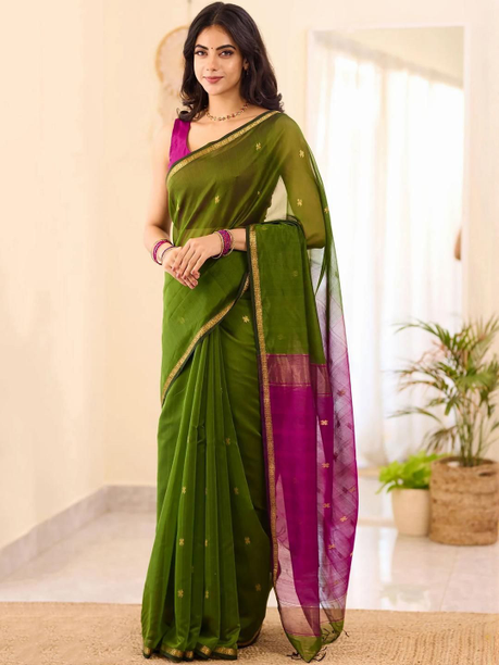 Solid Sarees: There’s nothing quite like a solid saree that has been accessorized with the right jewellery. You can never go wrong with a solid cotton silk saree. Pick a solid cotton silk sarees in colors like beige, red, black and purple and mix and match these sarees with printed