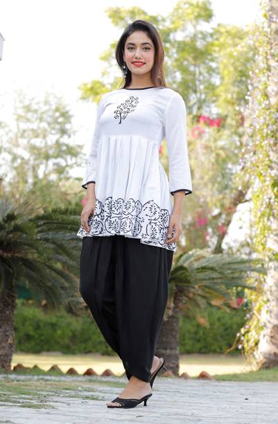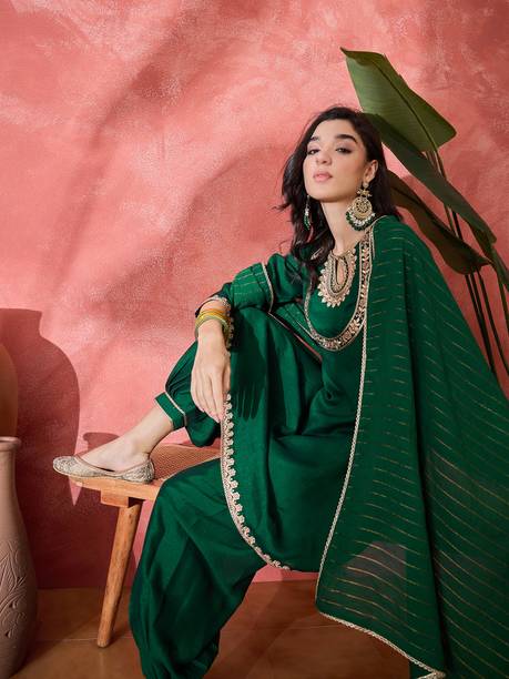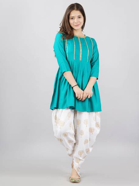 A dhoti salwar suit is an Indian attire that looks traditional yet trendy. The dhoti salwar or dhoti pants for women is the result of a modern twist given to the traditional dhotis worn by men. Dhoti pants are trendy bottom wear popular for their unique and stylish look. A solid pattern kurta or a top can ideally be paired with dhoti pants for a comfortable and casual look. An embroidered kurti paired with a dhoti salwar and a matching dupatta is a good option for parties, family functions, and festivals. A wide range of dhoti salwar suits (online) for women is available in a multitude of styles and patterns. You can buy dhoti salwar suit online offered by brands such as Rangeeli Fashion, Stylum, UK Fabric, Libas, Biba, Nayo, and many more.