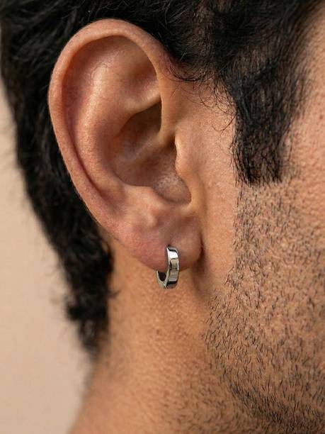 A huggie earring wraps very closely around the earlobe from one side to the other. Huggie earrings for men are in vogue and have been popularised by celebrities and artists. They tend to be thicker than hoop earrings and often come studded with gemstones.