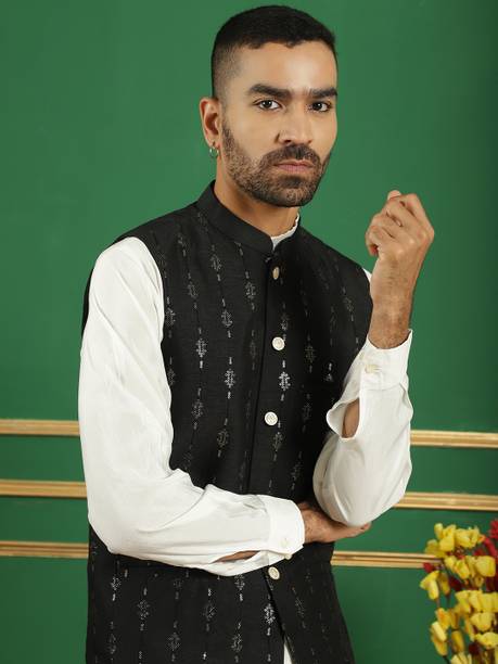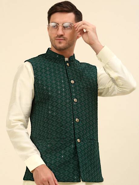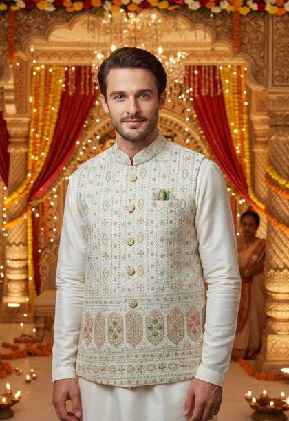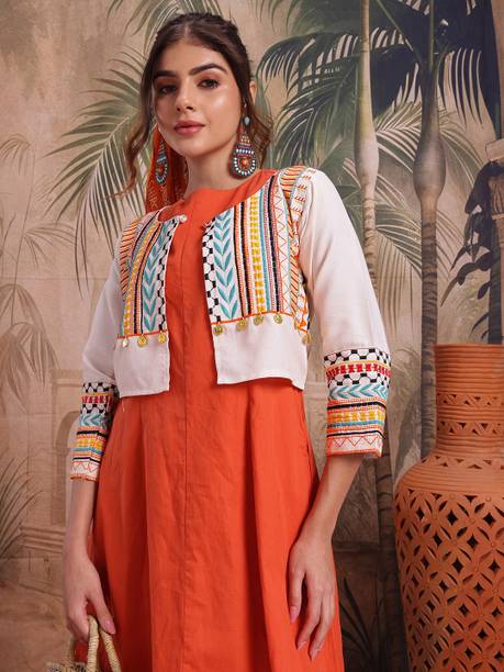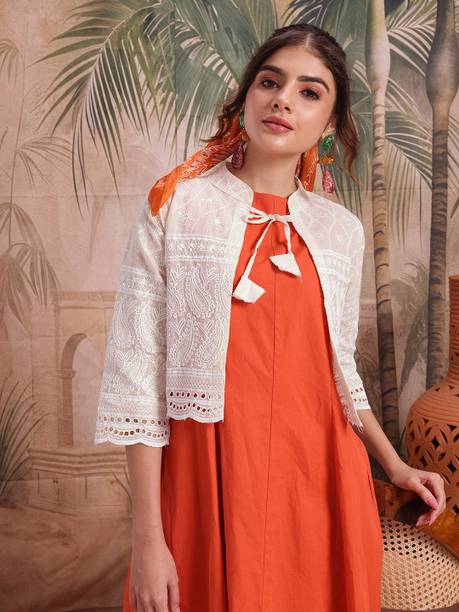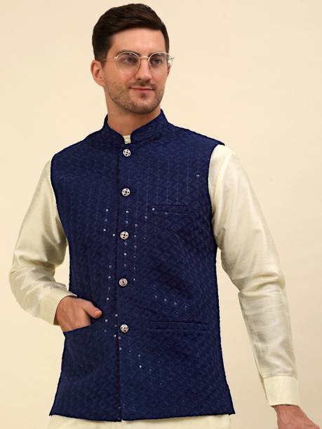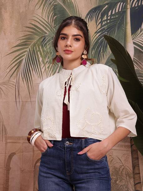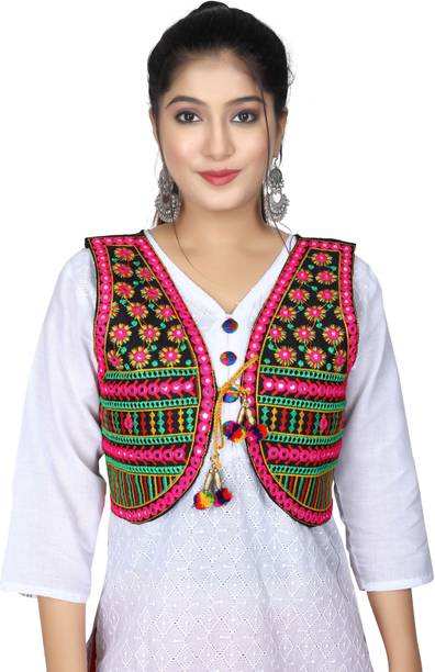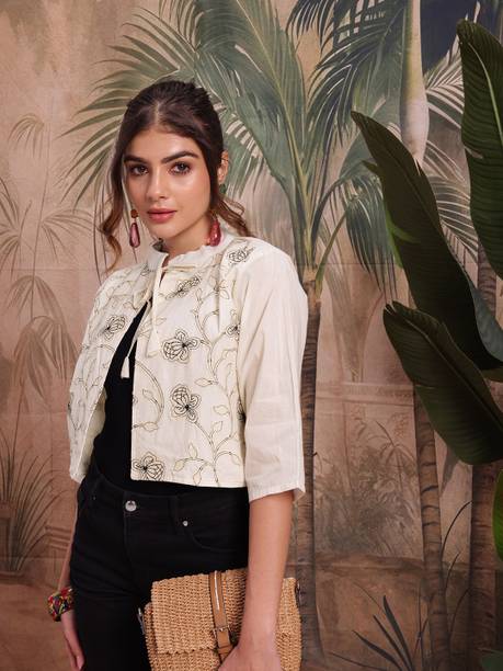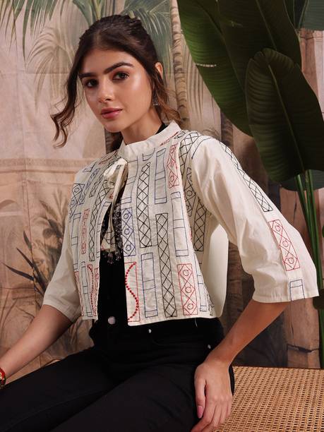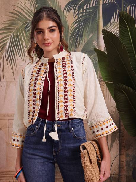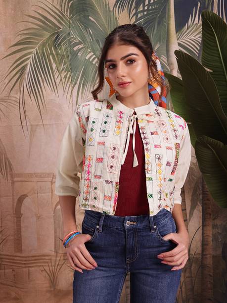 A comfort-wear that suits all seasons is embroidered jackets. They are cosy and are a forever trend in fashion and come with unique motifs, styles, designs, etc. You can wear them over your western-style pants and top or style them up over lehenga-cholis, kurtas, salwars, angrakhas, etc. Find your ideal size from XS to 4XL. They are suitable for men and women who wish to add flair to their looks during casual events, dates, festivals, sports events, parties, etc. Choose the fabric that blends with your looks. For example, denim jackets go well with casual tops and jeans pants, and the cotton-fleece blend is ideal for summer wear over jumpers and floral dresses, etc. When it comes to traditional looks, jackets embroidered and embellished patterns work wonders over kurtis, sherwanis, punjabis, etc. You can opt for half sleeves, full sleeves, three-fourth sleeves, and sleeveless options depending on the looks you are going for. For example, long flowing kurtis looks best with sleeveless jackets. On the other hand, you can pair a three-fourth sleeved jacket with a graphic printed top and capris. Check out your options for these vivid and beautiful embroidered jackets with brands. The information you are reading has been last updated on 08-Apr-26.