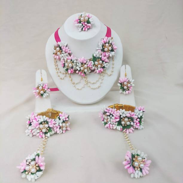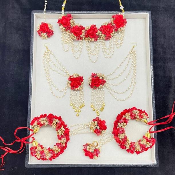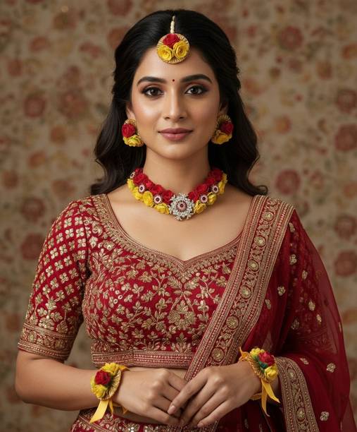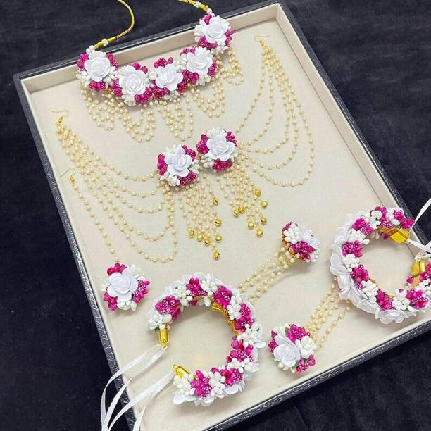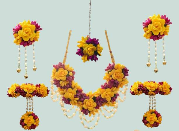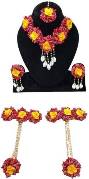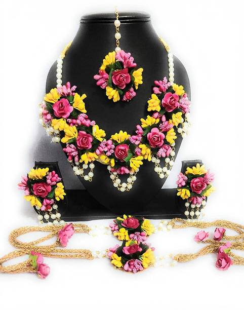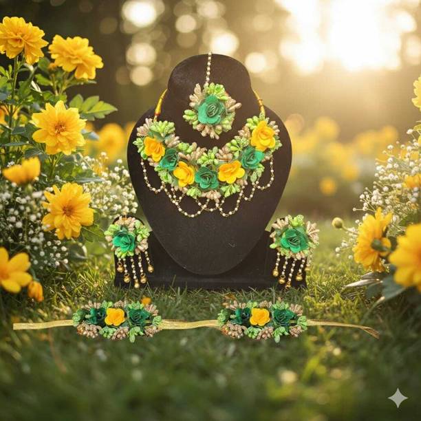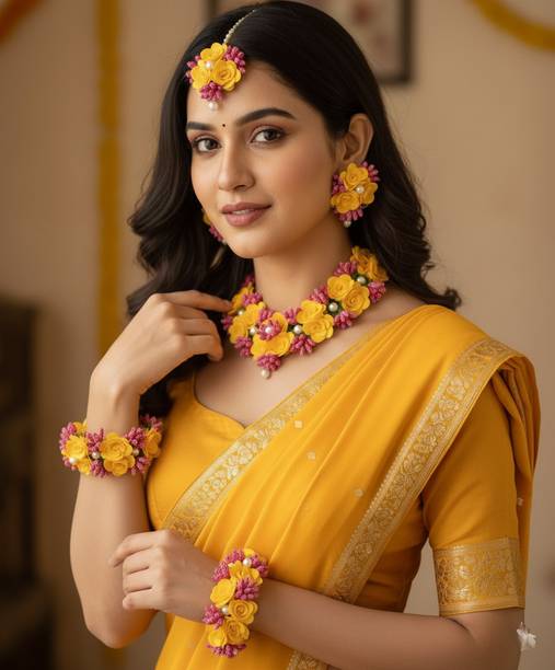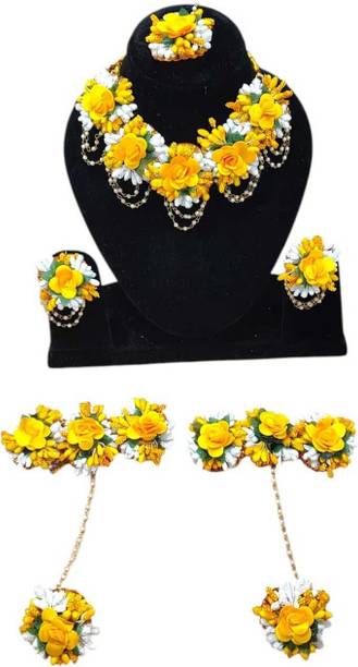 Jewellery is an inseparable part of an Indian woman's life. Floral jewellery is ideal for pre-wedding functions to make a trendy style statement. Explore a wide range of flower jewellery for haldi and mehendi functions. It will make you look pretty and feel special while adding natural elegance to your appearance. Choose from the collection of latest flower jewellery for haldi (new) sets, including necklace, hand-harness, matha patti, kamarbandh, payal, bajuband, earrings, tiara,maang tikka, and more in beautiful designs and vibrant colours. Explore the new collection of floral ornaments at a great offer. The floral jewellery is available in various materials like alloy, brass, cotton, metal, pearl, plastic, silk dori, paper, rubber, and more. The paper, plastic, and fabric ones are lightweight and comfortable to wear. Although yellow flower jewellery for haldi looks alluring, a little pop of colour on your haldi event will give you an edgy look. You can choose from quirky colours like blue, pink, orange, red, turquoise, and many more. Find your perfect piece at the best prices from popular brands like 12SEASONS, RAGABANDHA DESIGN STUDIO, Rozec, Global Ecom, Naazzfashionhub, and more. Buy the floral ornaments online and get it delivered to your doorstep. The information you are reading has been last updated on 23-Feb-26.