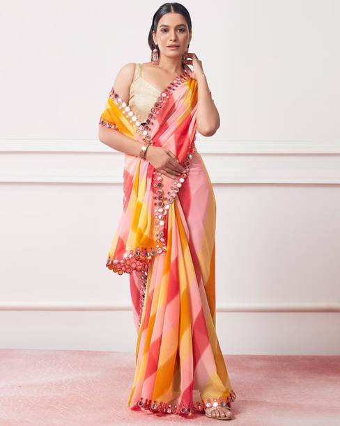 The georgette sarees are known for their grace and easy-to-drape quality. These sarees have a translucent, crinkled surface that makes it recognisable as a fabric. Such sarees are lightweight and convenient to wear for long hours. Flowing and gossamer-like, these sarees are breathable and keep you feeling cool even during the summer season. You can browse the collection of the latest georgette sarees and choose from various colours, prints, weaves, and combinations. You can select from floral print, hand-painted, embroidered, block printed, polka print, and many more in terms of patterns. Opt for different styles of sarees according to your requirements and the occasion. Choose from regular sari, stitched sari, lehenga sari, half and half sari, and many more. Opt for multi-coloured printed leheriya saree decorated with gota from Nimisha Fashion or striped and polka saree hand from Anand Sarees. Other brands you can choose these gorgeous georgette drapes from are SAARA, Fabwomen, Divastri, Varanga, 3SIX5, and more. You can also gift these beautiful weaves to your family and friends during special occasions and. Pick your favourite georgette sarees online and have them delivered to your doorstep. The information you are reading has been last updated on 23-Nov-25.