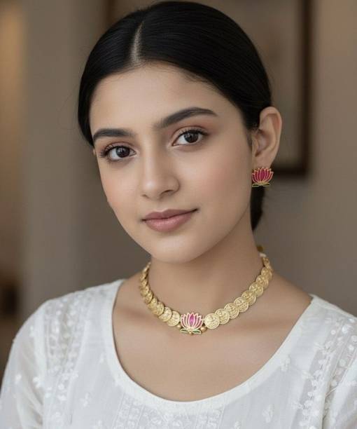 Gold chokers with tiny crystal pendants hanging from them are classic. Because of their simplistic design, you can wear these necklaces during special office events when you want to dress your ethnic best. They also tone down the jazz of ethnic wear that has a lot of design details going on. If you’re into elegant and fuss-free chokers, you might want to check out jewelry from brands like Bandish. Their choker necklace which has traditional Ginni coins, where each coin is imprinted with the Goddess Lakshmi, is notable. This statement necklace especially stands out when you wear it with elegant kurti sets or sarees in neutral colors.
