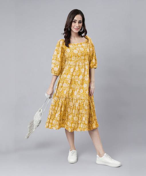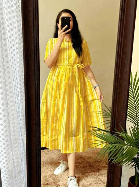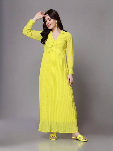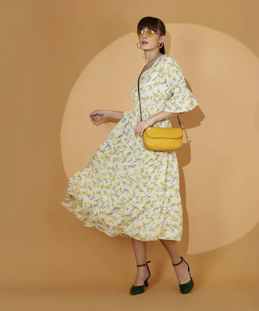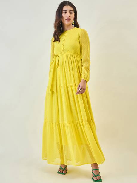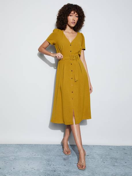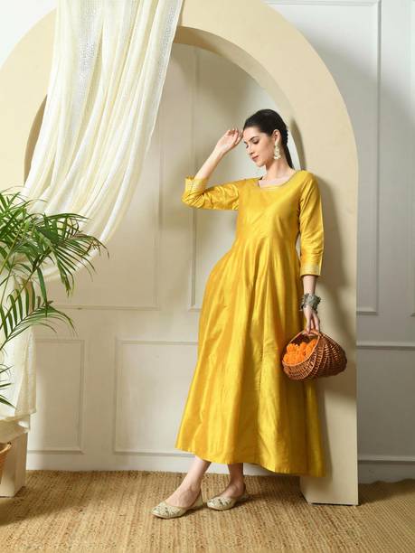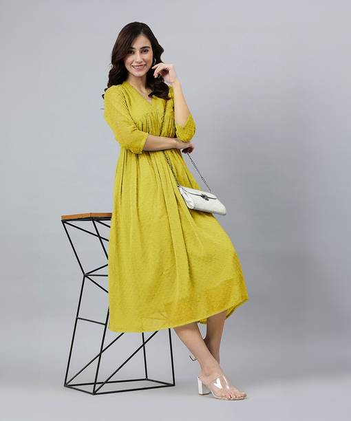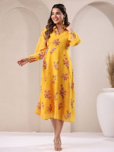 Shine bright in haldi dresses. These vibrant garments are perfect for all types of occasions like religious festivals, family events, formal occasions, brunch dates, casual outings, and more. All your options are available for traditional wear, Indo-western styles, and western looks. You can get the latest haldi dresses in designs like maxi dresses, bodycon, frocks, kurtas, high-lows, pleated, a-lines, long-shirts, etc. These beautiful attires are available in all sizes, and perfectly blend simplicity and style. Adorn yourself in attires made of comfortable fabrics like rayon, cotton, polyester, cotton silk, cotton lycra blend, poly cotton, lycra, georgette, and crepe. They feel soft on the skin and can make you stand out from the crowd. You can check out the wide collection of patterns like printed, colour block, textured, self-designed, striped, florals, geometric print, embellished print, etc. You can choose your sleeve length according to the seasons. For summers, try out sleeveless and short-sleeved looks. And for winters, full-sleeved, rolled-up sleeves, and three-fourth sleeves feel comfortable and warm. You can also choose from round neck, square neck, mandarin/chinese neck, collared neck, and off-shoulder styles. Some of the best brands for these haldi dresses are Aurelia, Varanga, Urban Alien, My Swag, and Mufti. The information you are reading has been last updated on 17-Jan-26.
