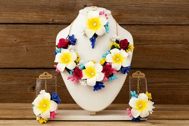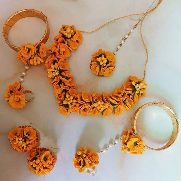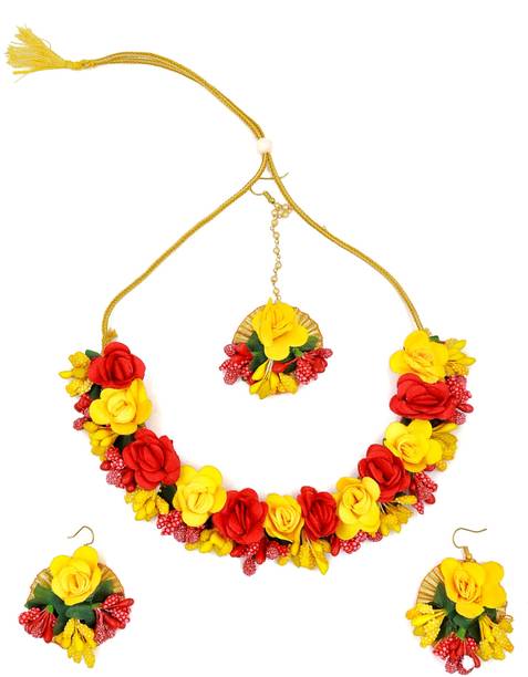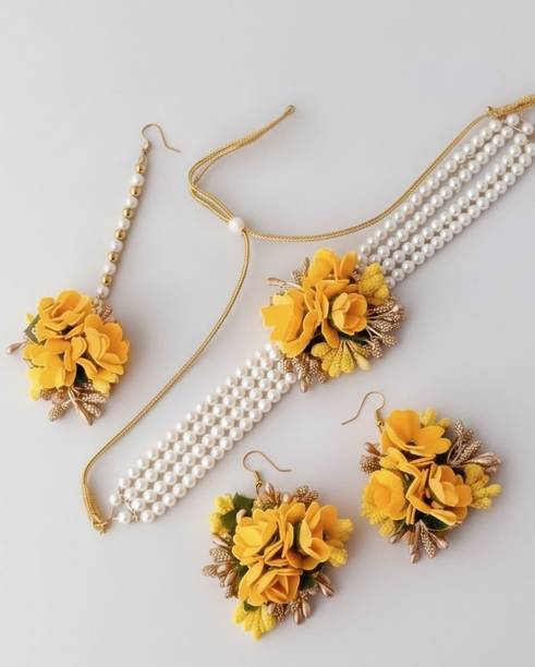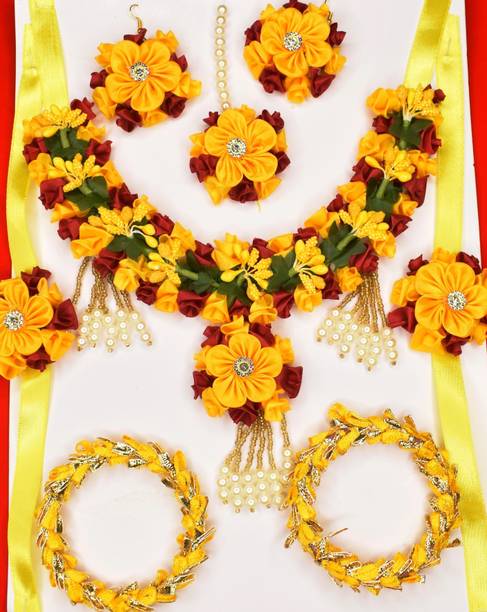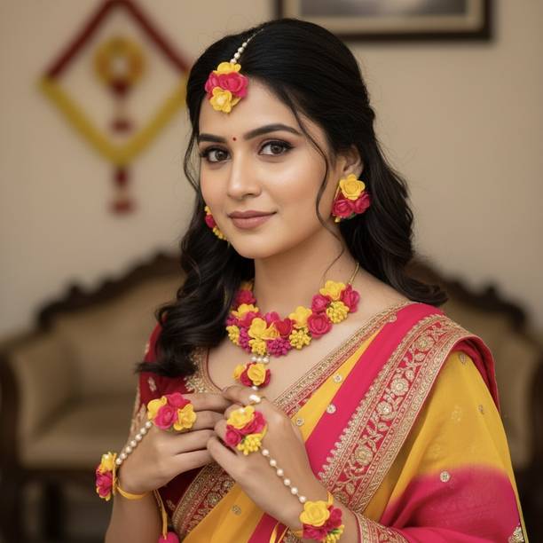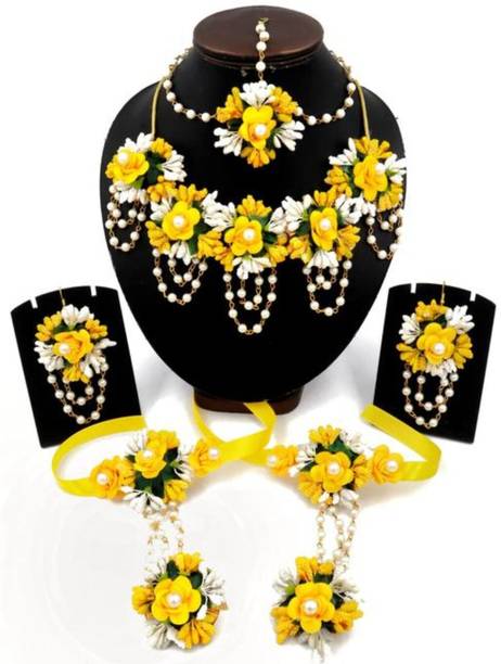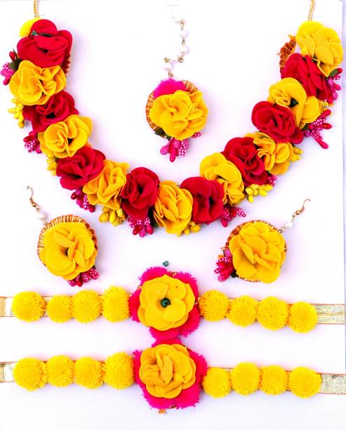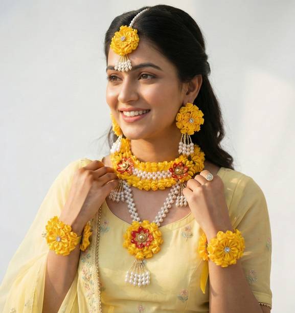 Haldi jewellery for the bride is jewellery made from artificial flowers. Flower jewellery plays a vital part in making the bride stand out and add natural elegance to her look. You can wear these jewellery pieces at a pre-wedding celebration such as Haldi or Mehandi. Floral jewellery is also often utilised at baby shower ceremonies as well, with the to-be-mom wearing fresh flower jewellery and a garland. However, because of the stunning patterns and wide range of colours available, many women currently choose artificial floral jewellery. You can browse the latest haldi jewellery for brides from a wide range of contemporary and ethnic collections. Choose from different brands like BDS CREATIONS, Rozec, JUI PEARLS, Ritzkart, Global Ecom, Floret, and many more, depending on your preferences. The collection of haldi jewellery for brides includes accessories made from different materials like fabric, fibre, paper, plastic, and cotton dori. You can choose from various haldi jewellery types like flower necklaces, flower maang tikka, flower earrings, flower armlets, and anklets. Shop for the best haldi jewellery online for your big day and enjoy hassle-free doorstep delivery. You can also gift these beautiful jewellery pieces to family and friends ahead of special occasions and important festivals. The information you are reading has been last updated on 21-Feb-26.