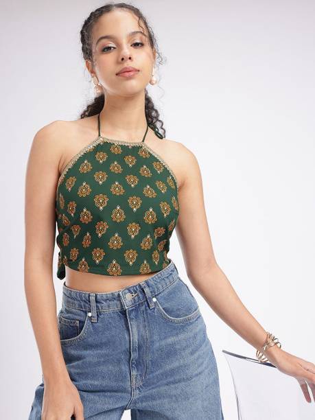 Halter neck tops are versatile wardrobe essentials that are available in a variety of patterns. You can find tops with prints, embroidery works, stripes, floral finishes, animal prints, lace works, polka dots, and so on. Whether you're looking for a simple top or a more statement piece for a special occasion, you can easily find a halter top that is best suited for you. Also, these latest tops are available in various fits, including regular, slim, relaxed, and oversized. Several brands offer halter tops online, including Tokyo Talkies, Harpa, Roadster, Vero Moda, Only, and so on. These tops have their unique styles, so you can easily find the ones that reflect your taste. These tops are made from quality fabrics, including silk, hosiery, acrylic, cotton, cotton, and crepe. Therefore, you can remain comfortable and breezy when you are flaunting these tops. So if you are looking for new tops to give your outfit collection a fashion upgrade, you can consider opting for these options, available at various price brackets. Place your order for trendy tops with a halter neck and get them delivered to your doorstep without any hassle. With online shopping, you can also enjoy safe transactions due to the availability of various payment methods.
