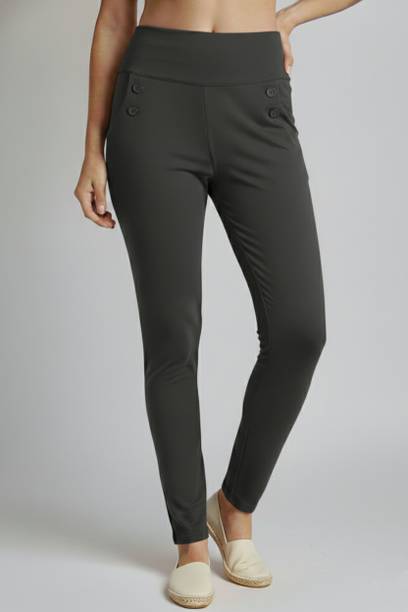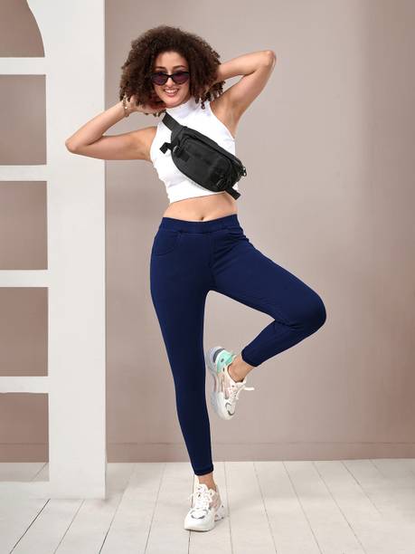 4. Trouser-style jeggings: Also known as treggings . In case you have a ‘retro day’ coming up at work or college, you can create the perfect look for the occasion with a pair of high-waisted treggings that feature zipper fasteners. You can choose to wear them with a tucked-in cotton shirt and pumps to complete your look.