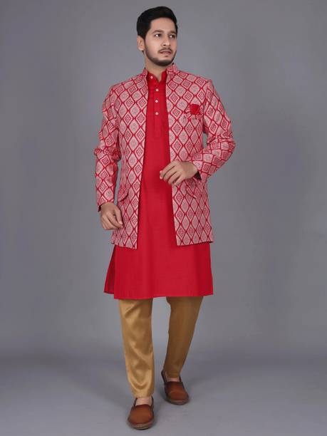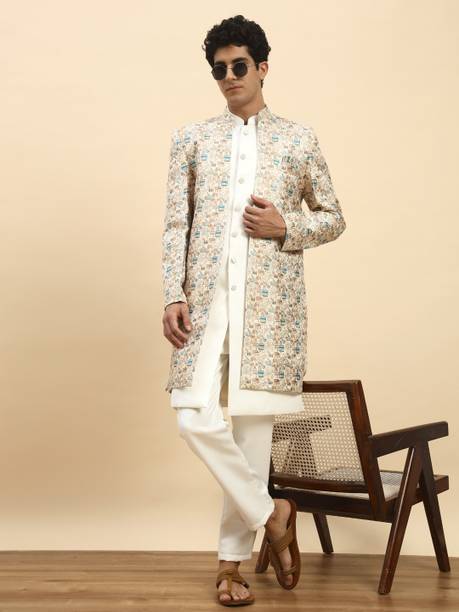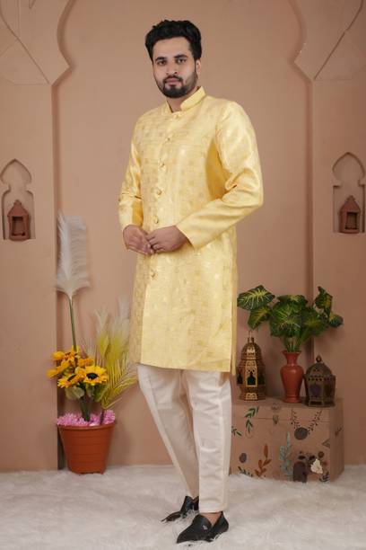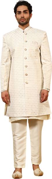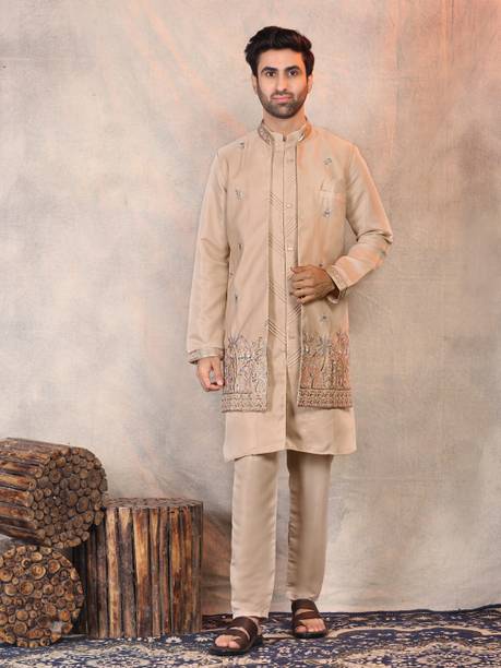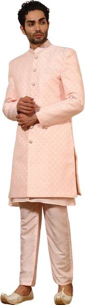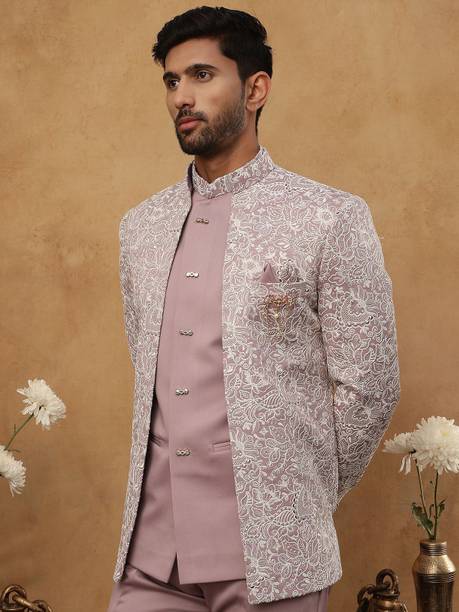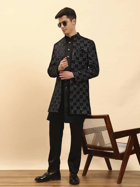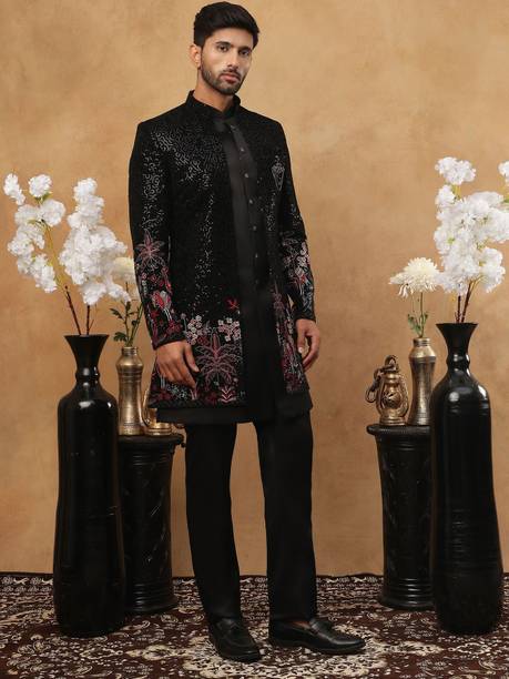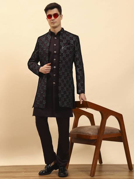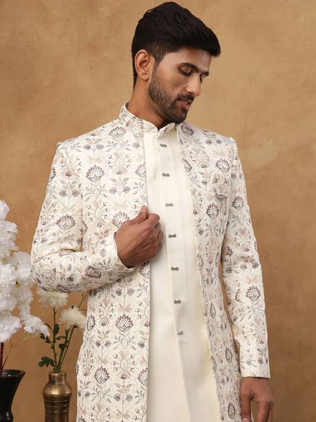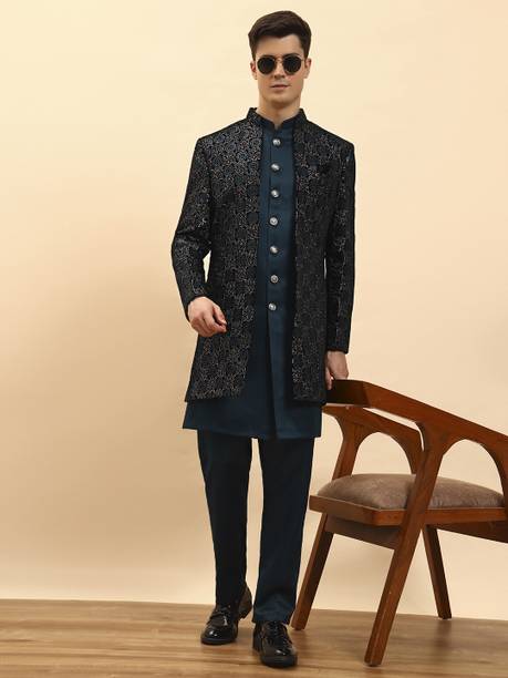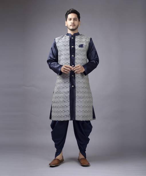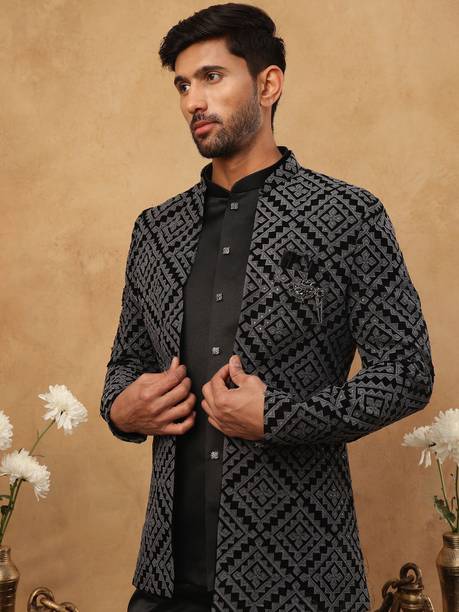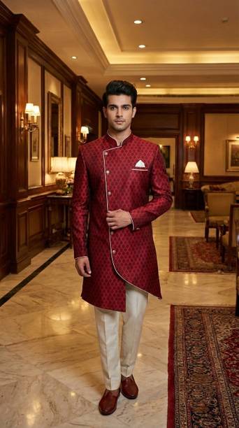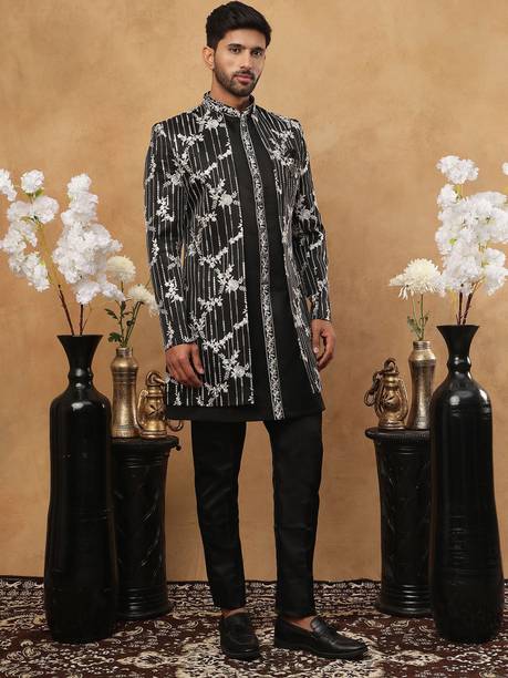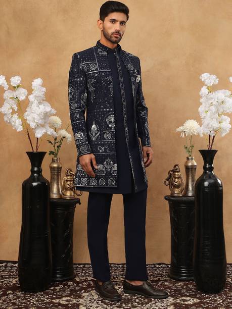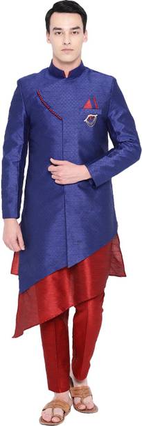 Have you been struggling to decide whether you want an Indian ethnic ensemble or a Western-style silhouette? If yes, then Indo-Western dresses for men can put an end to all your worries. These dresses are one of the styling options that makes you look put together without much effort. There is an array of dress options that allow you to look stylish. You can find this garment in unique hues, patterns, designs, and embroideries. Brands that sell Indo-western clothing for men online are Tanvi Creation, Maruti Fab, Modli 20 Fashion, Hiral Creation, Royal Kurta, and others. If you want to make a statement, choose dresses with bold colours and rich patterns. Indo-western outfits for men offer you the ability to blend tradition and contemporary fashion while making you look royal. This men's clothing comes in rich patterns and embellishments for special events. Out of multiple attires, you can opt for sherwanis for men that ensure versatility. Versatile sherwanis can be styled up or down according to your requirements. Some other types of dresses include the kurta and pyjama set, kurta and churidar set, front-slit kurta, and others. Buy the desired Indo-Western dress for men online and make a statement with your style.