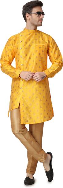 The Indo-western sherwani is typically a long coat-like garment which is worn over a kurta. This combination is finished off with a churidar, salwar, or dhoti. The entire look of these men’s clothing is indulgent as it is, but certain occasions call for you to go all out. Seize the chance by stepping out in silk jacquard sherwani sets with intricate embroidery detailing. Sherwani sets which come with heavily embellished churidars or sherwanis spell opulence, and are sure to put you in the spotlight.