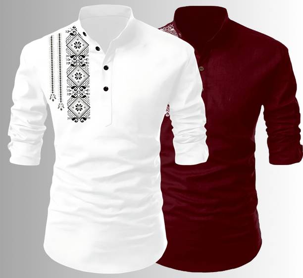 Spruce up your ethnic wardrobe with chic men’s kurta shirts available online. You can pair these kurtas with bottom wear like Jodhpuri, dhoti, churidaar, or salwar for a traditional touch, or wear them with denim, cargoes, or trousers for a modern and casual look. These men’s kurta shirts are available in a variety of lengths, patterns, and options ranging from vibrant and monochromatic solids to stripes, polka, and motifs. Explore from a plethora of prints in geometric patterns, abstract, block prints, kalamkari, ikkat, self-design or work like applique, embroidery, embellished, or variations like textured, washed, chikankari, and more. You can select mens’ kurta in varying lengths, cuts, and silhouettes, based on your preferences and the occasion. Kurtas in cotton, jute, linen, and blends are great for summers and casual occasions, while rich fabrics like silk, satin, jacquards are ideal for special events like weddings or festivals. Amp up the looks by adding an ethnic jacket or a matching stole. You can shop for these traditional and ethnic clothing from brands such as Manyavar, House of Pataudi, Indus Route by Pantaloons, MeLANgE, MADE IN THE SHADE, and more. The information you are reading has been last updated on 27-Dec-25.