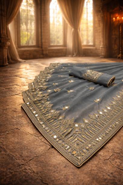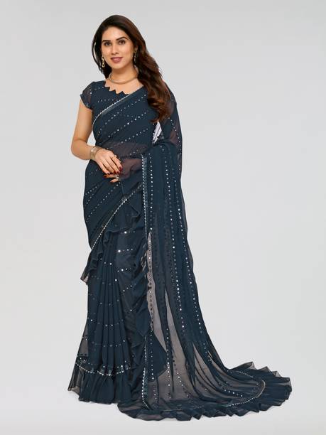 These sarees are generally monochromatic and have a lot of mirror work done on them with some embroidery work as well. The bigger roundels are used in this saree, and placed towards the border to enhance the visual appeal.