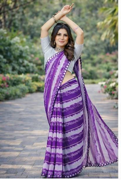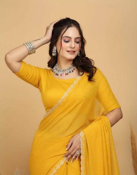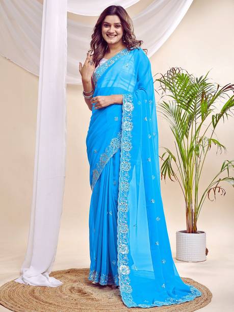 Chiffon, Jacquard, Georgette, and Lace are materials that are used to craft these divine sarees. They are soft, lightweight and can be handled with ease. They are low maintenance fabrics, so it is easy to wash them as well!