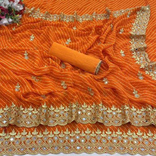 This is the authentic style of Gujarat. The saree is composed of more than one color and has mirror work scattered throughout the cloth. The mirrors used for this saree are generally small and are accompanied by tiny beads and embroidery work. Therefore, these sarees look a lot more grand when compared to other sarees of similar styles.