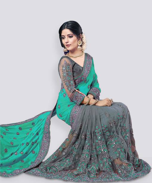 These sarees are generally monochromatic and have a lot of mirror work done on them with some embroidery work as well. The bigger roundels are used in this saree, and placed towards the border to enhance the visual appeal.