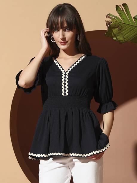 Every woman's wardrobe needs modern tops for jeans that are made of breathable materials. Stay in style and at ease with tops that are all about party vibes. You can also find stunning pieces with neck designs like one shoulder, shirt collar, polo neck, shawl neck, crew neck, turtle neck, and others. Search tops for occasions like parties, casual, formal, festive, weddings, loungewear, and various others available online. This stylish piece of clothing deserves a spot in your wardrobe. You can slip into comfortable tops no matter where you go. To meet your style preferences, you can find this garment in various patterns like solid, printed, embroidered, striped, floral print, self-design, and others available online. Brands that sell this modern top are Only, Forever 21, Urbanic, Levi's, Van Heusen, and others. Pastel colour attire acts as an effortless piece of clothing that will make you look sophisticated. To stay comfortable throughout the day, you can pick an attire from fabric options like bhagalpuri silk, georgette satin blend, synthetic leather, poly crepe fabric lining inside ruffled, jacquard, cotton satin blend, and others. Get your hands on modern tops for jeans available in myriad designs and colours to create a perfect fashionable look.