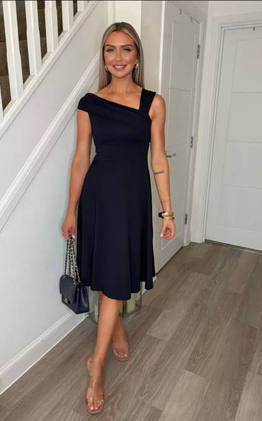 A-line dresses are the most versatile pieces that can be worn for both day and night. These dresses exude an elegant and polished vibe. You can buy an A-line dress with scalloped hems and sleeves or you can go for an off-shoulder A-line dress to make heads turn. Style your navy blue A-line dress with a pair of strappy heels or pumps and carry a sleek clutch to finish off this stylish look.