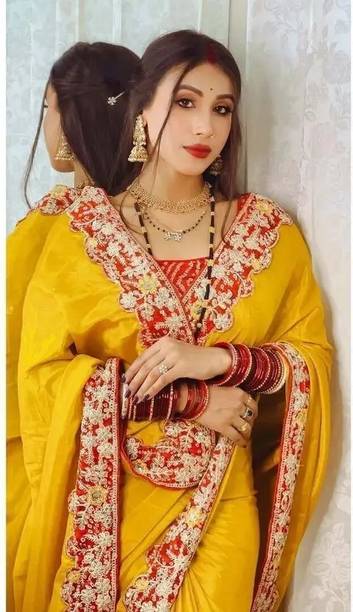 The saree is named after a small town known as Gadwal in Andhra Pradesh. These sarees can either be pattu, cotton, or a hybrid of the two. The border of this saree is usually made of tussar silk. A special technique called Kuppadam is used when making these sarees. Pure pattu sarees aren’t as popular as hybrids are and you get a wide variety of the hybrids one online.The designs on these yellow fashion sarees are usually based around Lord Murugan and Rudraksha. Sometimes they come in designs that depict the culture and traditions of South India.
