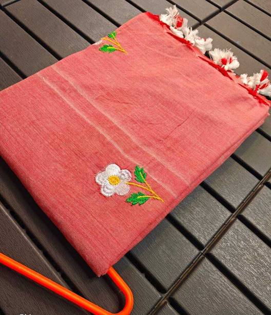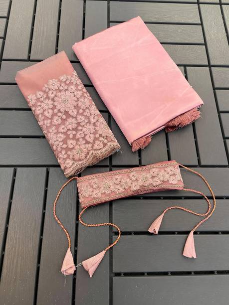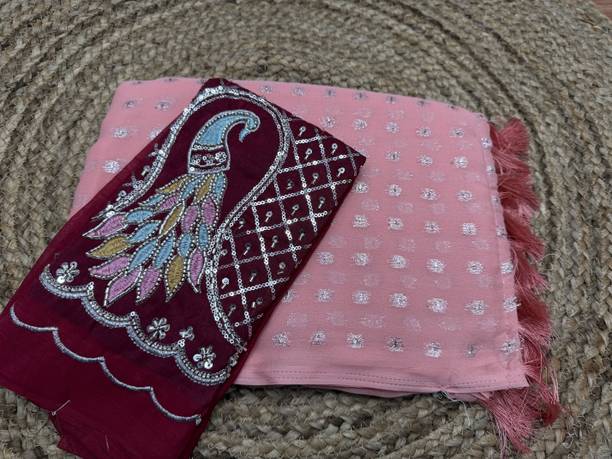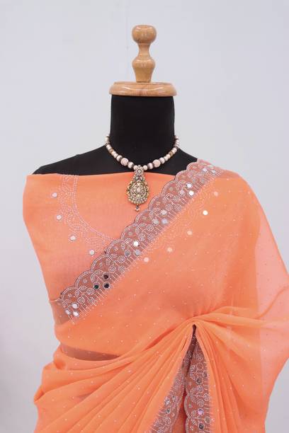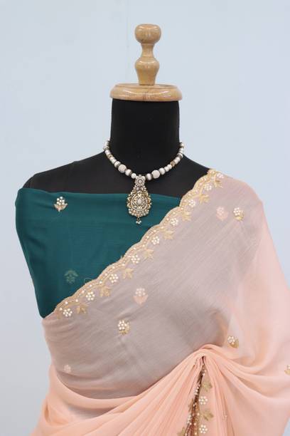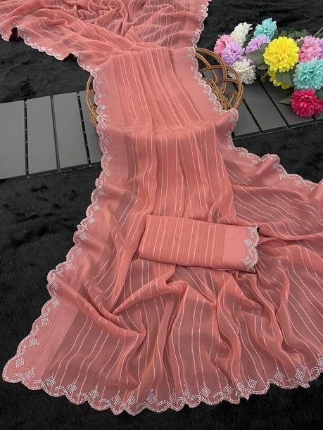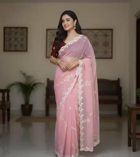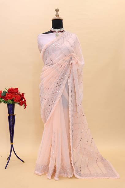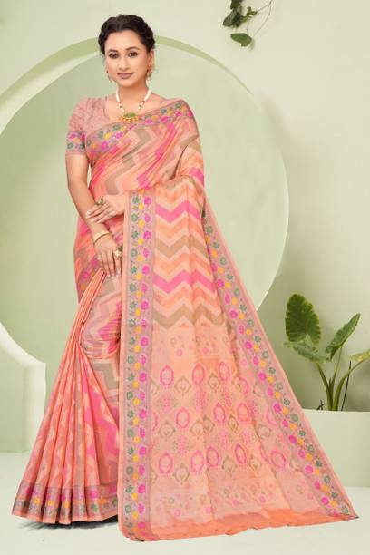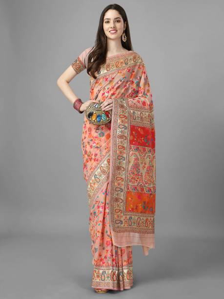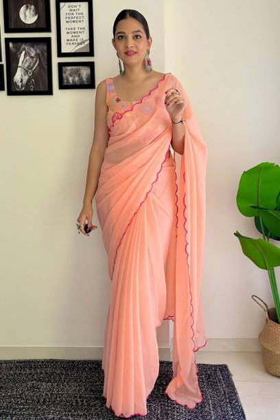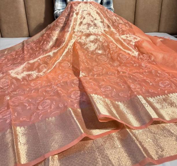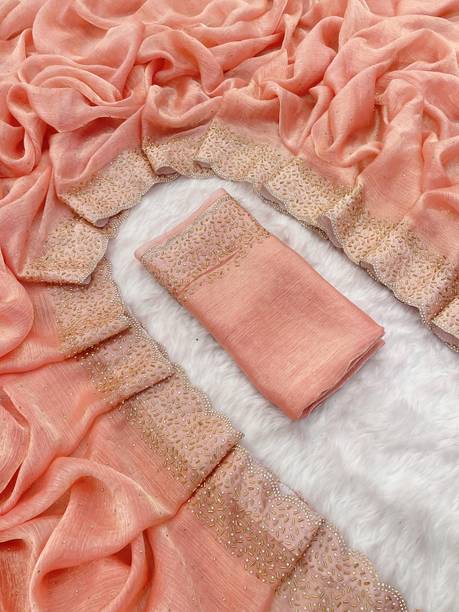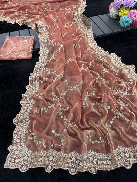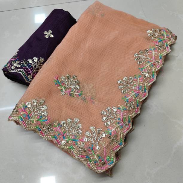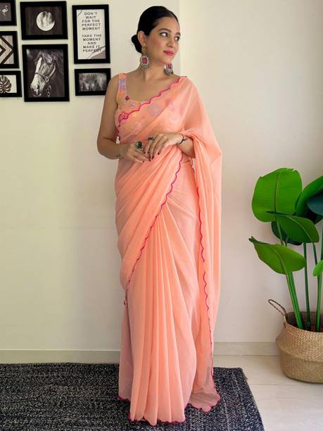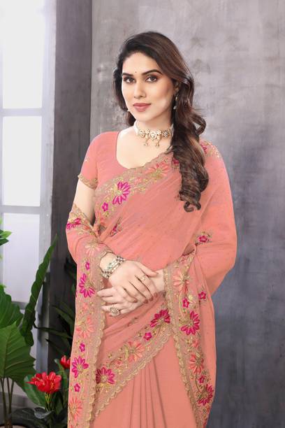 Peach-colored Embroidered Brasso, Crepe Fashion Sarees