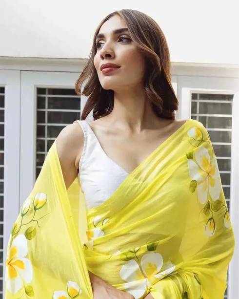 These sarees are lightweight and can be easily carried off in parties or on festive occasions. The half and half design is another famous fashion trend, where one half is different from the other in prints and colors. You can drape these peach-colored brasso and crepe sarees with a gold-toned silk tie-up blouse to look absolutely gorgeous. Add final touches of extra style by accessorizing with dangle earrings, finger rings and a pair of block-heeled sandals.