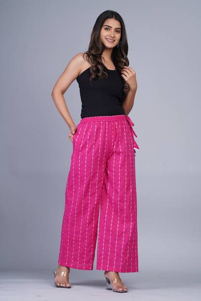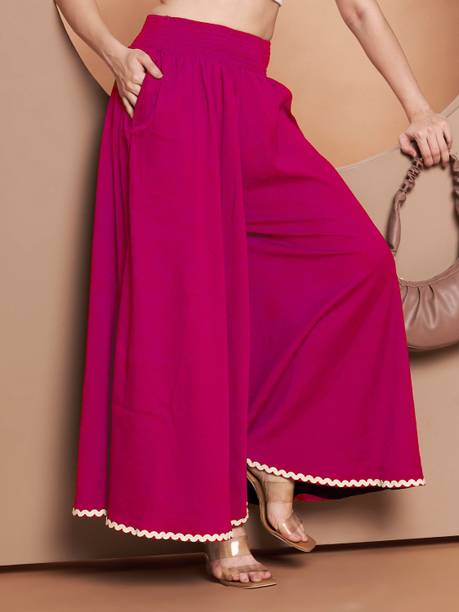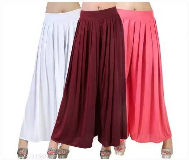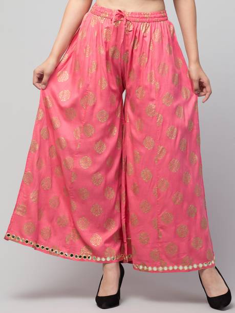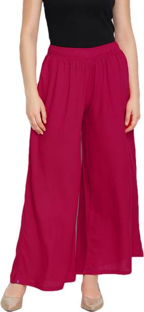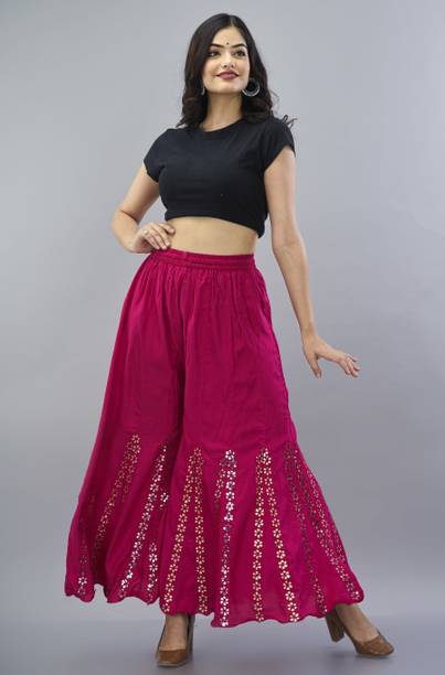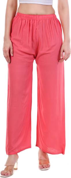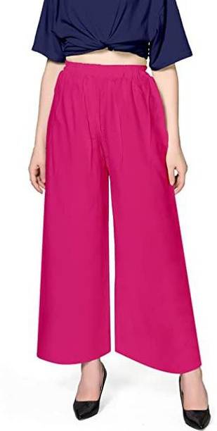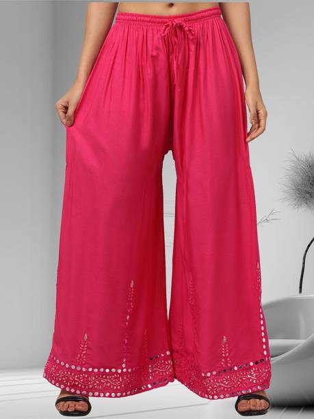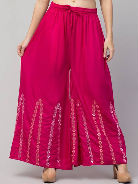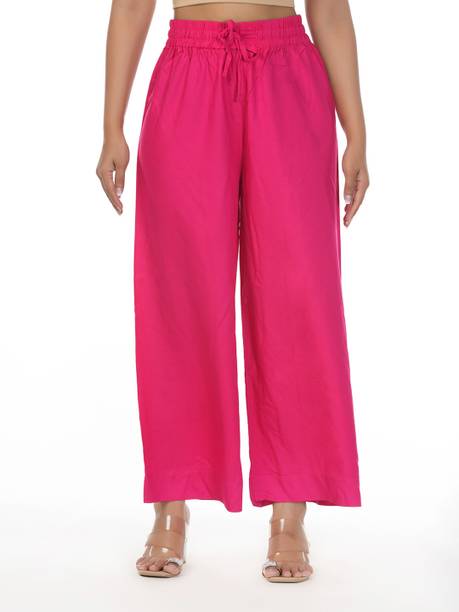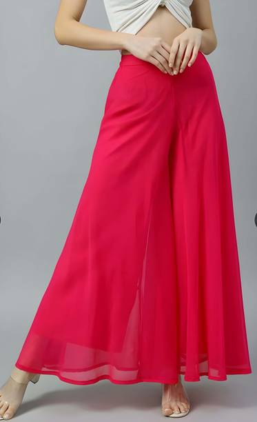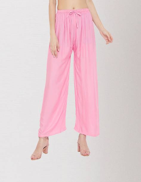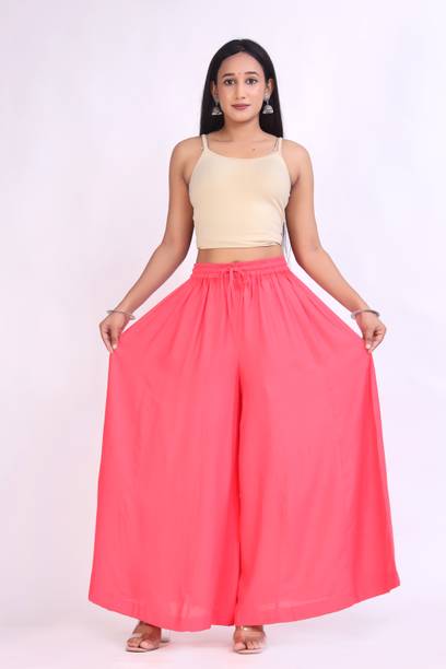 Are you on the hunt for fashionable and comfy outfits? Explore pink palazzo and more online displaying modern styles in women’s clothing. Contemporary apparel comes in distinct patterns, colours, and sizes. Browse and choose from options like solid, fit and flare, printed, flared, stripes, and so on. You can create an indo-western look by opting for stylish pink palazzo pants. You can team up palazzo with a long kurta, casual T-shirt, crop top, or embroidered shirt, as per your style preference. Complete the look by putting on high heels or flat sandals along with matching jewellery pieces. The trousers can be worn on festive occasions, casual outings, formal gatherings, and more. The fusion wear is made of breathable fabrics, which makes it suitable for everyday use. You can choose from crepe, viscose rayon, wool, and polyester. Check the product description to get more information on the fit, rise, fabric care instructions, and more. Kurta and palazzo sets, as well as a single palazzo, are both available online. Compare the alternatives and pick the wide-flared trousers that suit your requirements. Buy trendy bottom wear from brands like Cloud Star, Get Styled, Shree Shital Print, Aurelia, Tokyo Talkies, and many more.