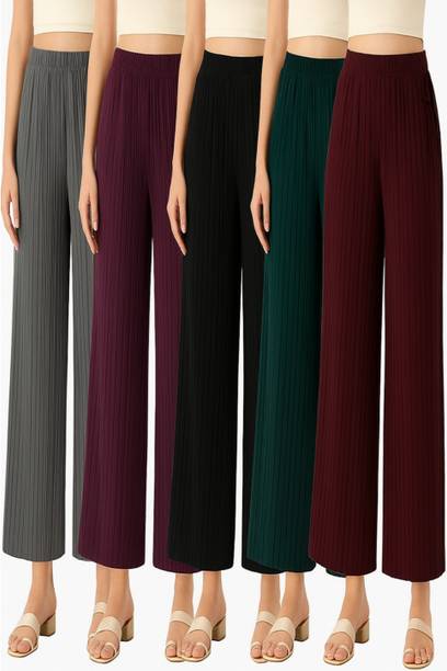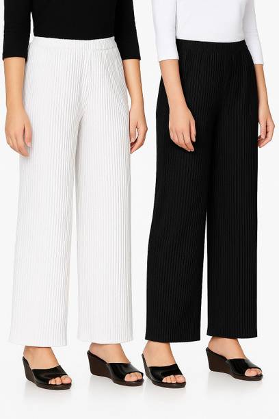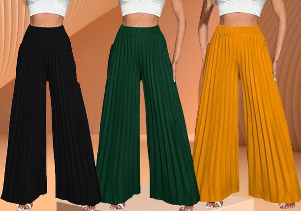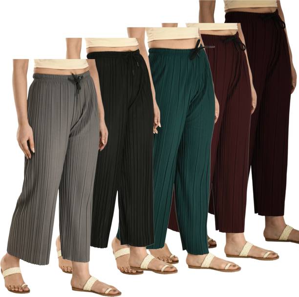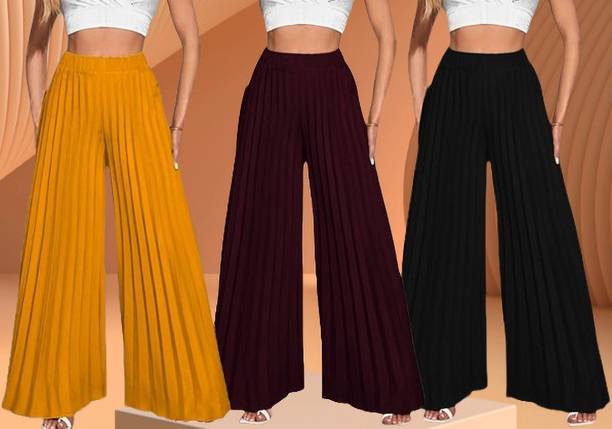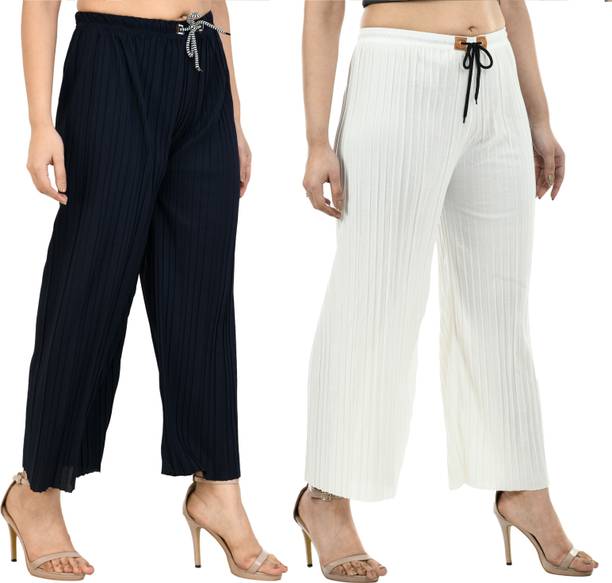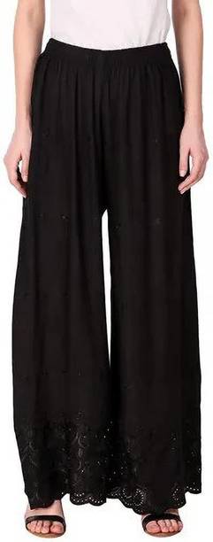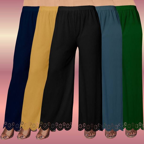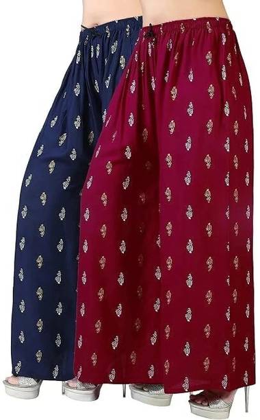 If you are an office-going woman, palazzo pants are a must-have in your collection. Palazzo designs (new) are available online to match your style and aesthetic. This free-flowing pants can be paired with an embroidered kurta for special occasions. To style it down, you can wear a pastel-colored kurta with these pants. They provide enough air and are perfect to wear on a summer day. You can choose from the fabric options like rayon, pure cotton, cotton blend, cotton rayon blend, georgette, cotton fleece blend, and more available online. These pants can increase your grace without much effort and can be paired in multiple ways. Purchase this bottomwear from brands like 109°F, 2 Kolpol, 20Dresses, 24Hour Fashion, 5stitch, and more present online. To match your style preferences, you can find multiple pattern options like striped, embroidered, solid, dip and dye, applique, camouflage, and more. Choose pants that represent your personality and make you feel confident. For special events, you can purchase pants with ruffle designs that can be paired with short tops or kurtis. These pants are available for occasions like casual, party, formal, festive, and loungewear. Buy palazzo designs (new) that match your style statement and pair them up with accessories to look effortlessly beautiful.