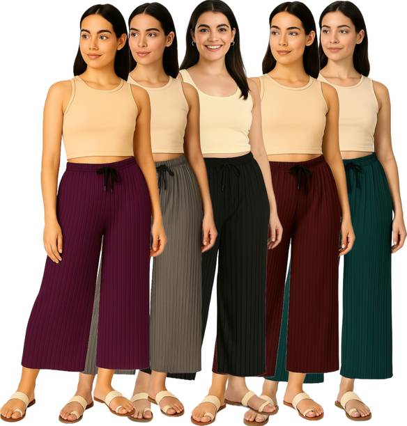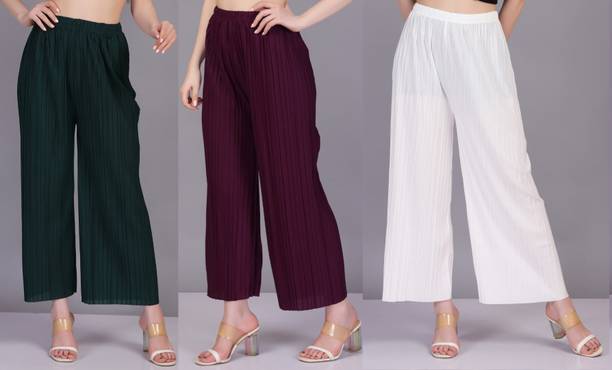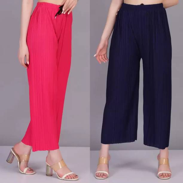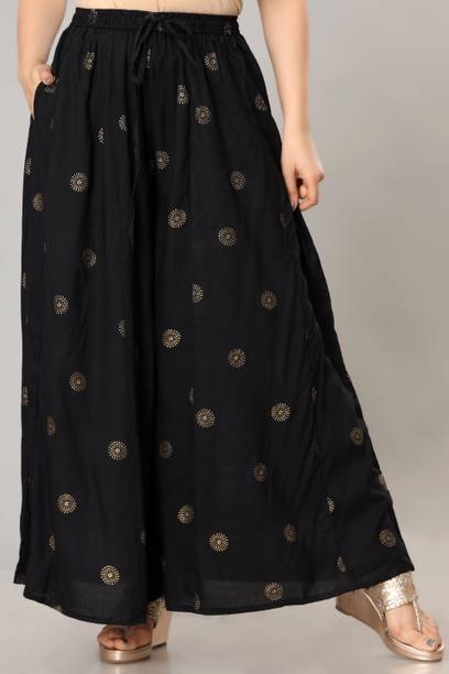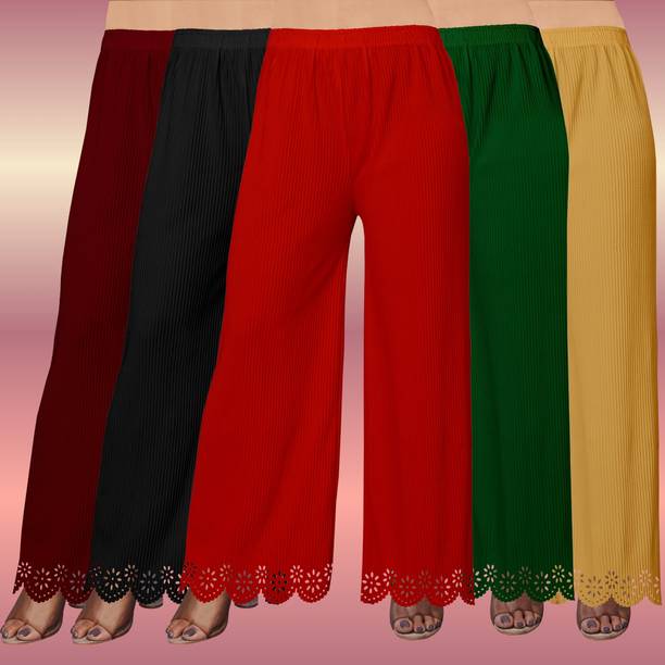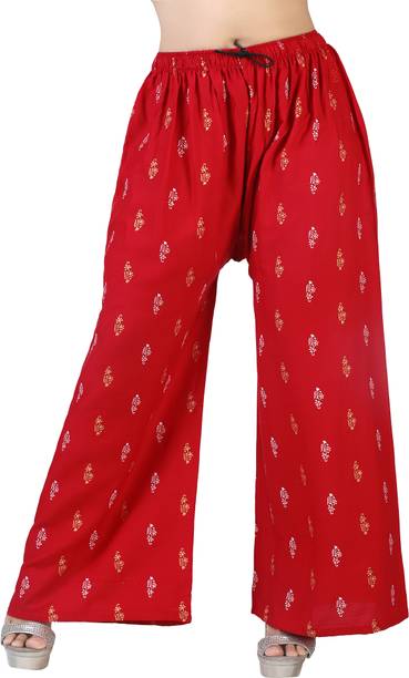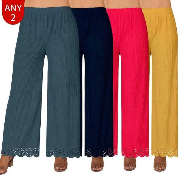 If you are an office-going woman, palazzo pants are a must-have in your collection. Palazzo designs (new) are available online to match your style and aesthetic. This free-flowing pants can be paired with an embroidered kurta for special occasions. To style it down, you can wear a pastel-colored kurta with these pants. They provide enough air and are perfect to wear on a summer day. You can choose from the fabric options like rayon, pure cotton, cotton blend, cotton rayon blend, georgette, cotton fleece blend, and more available online. These pants can increase your grace without much effort and can be paired in multiple ways. Purchase this bottomwear from brands like 109°F, 2 Kolpol, 20Dresses, 24Hour Fashion, 5stitch, and more present online. To match your style preferences, you can find multiple pattern options like striped, embroidered, solid, dip and dye, applique, camouflage, and more. Choose pants that represent your personality and make you feel confident. For special events, you can purchase pants with ruffle designs that can be paired with short tops or kurtis. These pants are available for occasions like casual, party, formal, festive, and loungewear. Buy palazzo designs (new) that match your style statement and pair them up with accessories to look effortlessly beautiful.