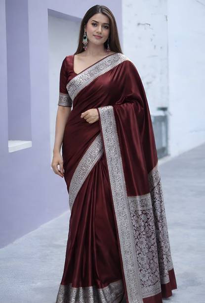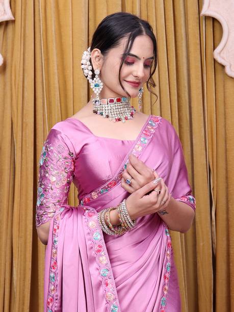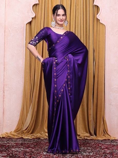 The smooth, lustrous texture of Satin silk sarees gives them a luxurious and classy finish. The fabric provides an elegant drape that can be layered well, enhancing your appearance. The smooth feel and glossy look of these sarees make them the ideal clothing choice for parties and as festive wear. They look especially great as evening wear due to their shiny appearance. There are numerous ways you can style this versatile attire. The solid coloured satin silk sarees can go well with sequined, sparkly, or printed designer blouses. You can choose to wear a full-sleeved high-neck top of similar texture with an embroidered or embellished variant to attain a royal look. Wear them with a string of pearls or other precious and semi-precious stones; these sarees can look elegant with just about anything. Ruffle satin sarees bring a voguish and trendy touch to your wardrobe. You can wear them to parties for a distinctive and fashionable look. Paired with metallic high heels and a beaded clutch, you can create the perfect party look with these sarees. You can shop for satin silk sarees online from brands such as Aagaman Fashion, Alakh Creation, Arya Dress Maker, A3 Fashion, and Aadhya Creation. The information you are reading has been last updated on 28-Feb-26.