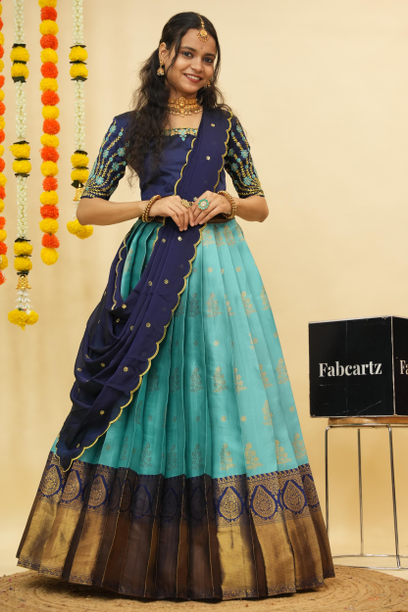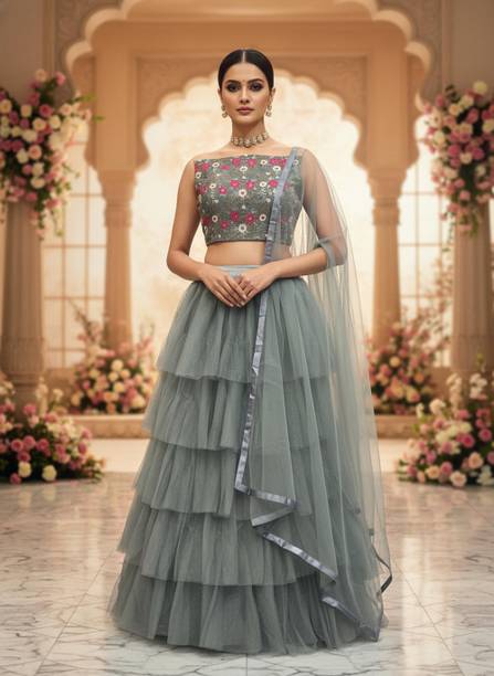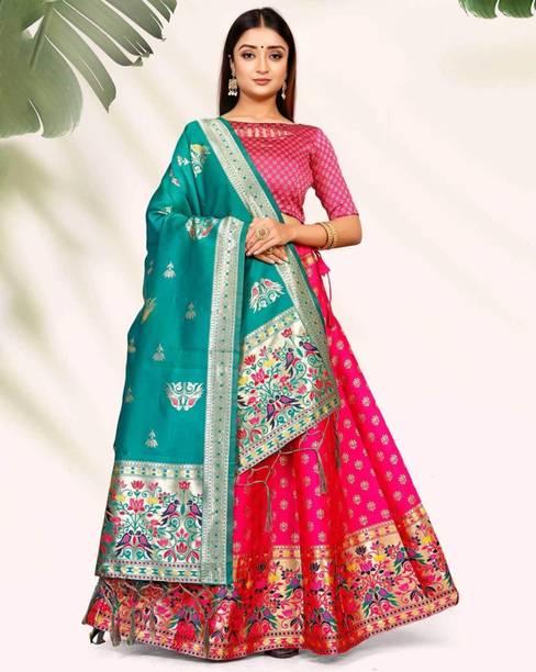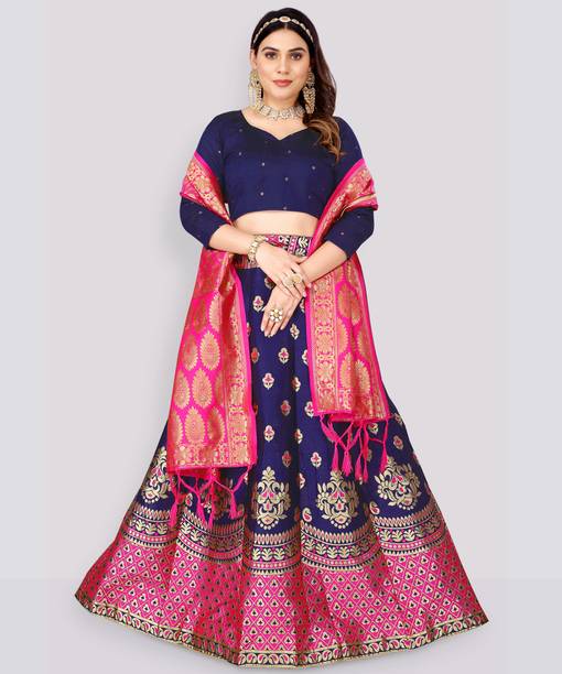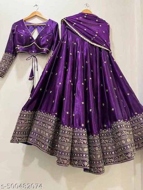 Silk lehenga choli is traditional Indian apparel for festive occasions. The classic long colourful skirts with matching short blouse tops are tailored with finesse to give a sophisticated look at weddings, engagements, parties, and festivals. There are varieties of basic styles such as lehenga and crop top, lehenga and kurta, lehenga with jacket, lehenga skirt, Rajasthani Poshak, etc. Many patterns, such as leheriya, bandhani, appliqué, polka print, floral print, etc., can be accessed online. The cholis have various themes such as gold accents, broad borders, brocade, red and gold, Ikkat prints, etc. Additional fabrics are attached to the silk lehenga choli sets, such as net, taffeta, nylon net, velvet, embroidered borders, etc., to add to the grandeur. With varied silk qualities like raw silk, art silk, pure silk, silk-wool blend, silk-cotton blend, etc., you may choose from the appropriate type that suits the occasion. Different sleeve patterns, such as full sleeves, half, short, three-fourth, sleeveless, etc., are obtainable in the lehenga choli sets. Browse through the options and select the latest silk lehenga choli (new) designs in your favourite colour and appropriate size with the best prices and exclusive offers. Buy a suitable lehenga set from brands such as Shadow & Saining, Shree Sadhi Fashion, Maakhodal, Shyam Sundar Creation,Kedar Fab, etc. The information you are reading has been last updated on 18-Nov-25.