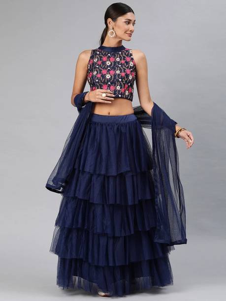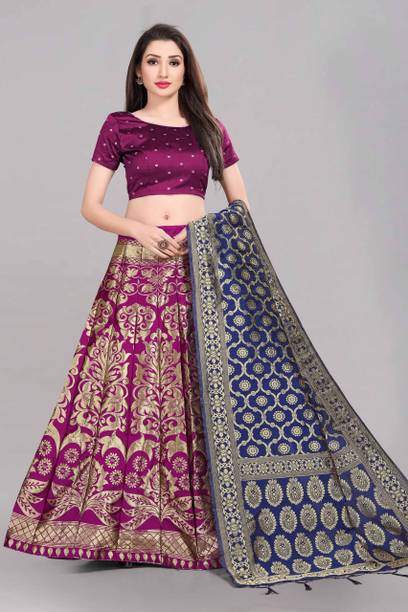 Silk lehenga choli is traditional Indian apparel for festive occasions. The classic long colourful skirts with matching short blouse tops are tailored with finesse to give a sophisticated look at weddings, engagements, parties, and festivals. There are varieties of basic styles such as lehenga and crop top, lehenga and kurta, lehenga with jacket, lehenga skirt, Rajasthani Poshak, etc. Many patterns, such as leheriya, bandhani, appliqué, polka print, floral print, etc., can be accessed online. The cholis have various themes such as gold accents, broad borders, brocade, red and gold, Ikkat prints, etc. Additional fabrics are attached to the silk lehenga choli sets, such as net, taffeta, nylon net, velvet, embroidered borders, etc., to add to the grandeur. With varied silk qualities like raw silk, art silk, pure silk, silk-wool blend, silk-cotton blend, etc., you may choose from the appropriate type that suits the occasion. Different sleeve patterns, such as full sleeves, half, short, three-fourth, sleeveless, etc., are obtainable in the lehenga choli sets. Browse through the options and select the latest silk lehenga choli (new) designs in your favourite colour and appropriate size with the best prices and exclusive offers. Buy a suitable lehenga set from brands such as Shadow & Saining, Shree Sadhi Fashion, Maakhodal, Shyam Sundar Creation,Kedar Fab, etc. The information you are reading has been last updated on 04-Oct-25.