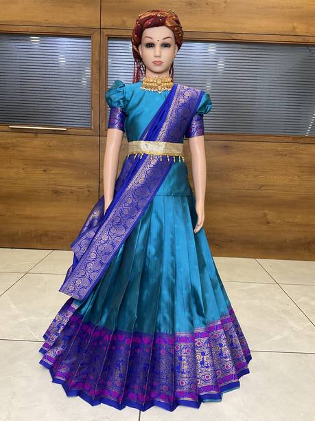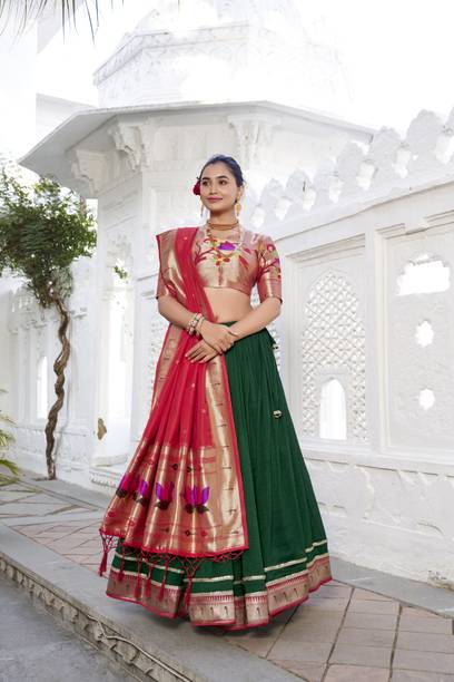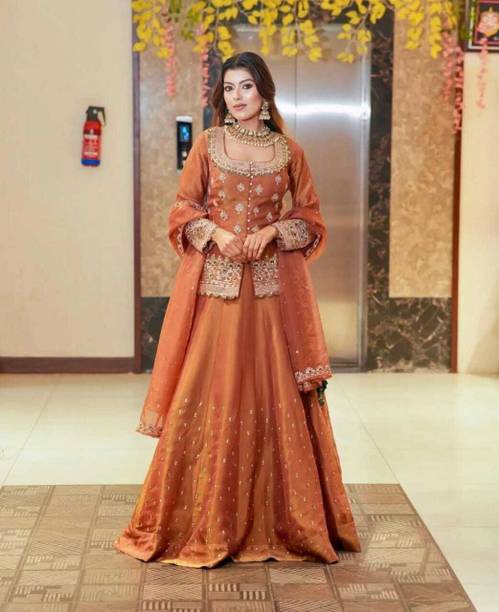 Silk lehenga choli is traditional Indian apparel for festive occasions. The classic long colourful skirts with matching short blouse tops are tailored with finesse to give a sophisticated look at weddings, engagements, parties, and festivals. There are varieties of basic styles such as lehenga and crop top, lehenga and kurta, lehenga with jacket, lehenga skirt, Rajasthani Poshak, etc. Many patterns, such as leheriya, bandhani, appliqué, polka print, floral print, etc., can be accessed online. The cholis have various themes such as gold accents, broad borders, brocade, red and gold, Ikkat prints, etc. Additional fabrics are attached to the silk lehenga choli sets, such as net, taffeta, nylon net, velvet, embroidered borders, etc., to add to the grandeur. With varied silk qualities like raw silk, art silk, pure silk, silk-wool blend, silk-cotton blend, etc., you may choose from the appropriate type that suits the occasion. Different sleeve patterns, such as full sleeves, half, short, three-fourth, sleeveless, etc., are obtainable in the lehenga choli sets. Browse through the options and select the latest silk lehenga choli (new) designs in your favourite colour and appropriate size with the best prices and exclusive offers. Buy a suitable lehenga set from brands such as Shadow & Saining, Shree Sadhi Fashion, Maakhodal, Shyam Sundar Creation,Kedar Fab, etc. The information you are reading has been last updated on 08-Oct-25.