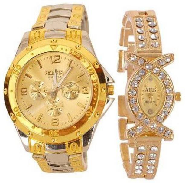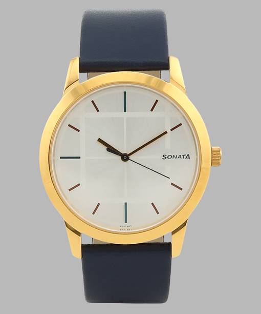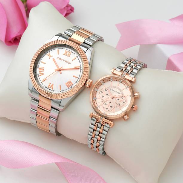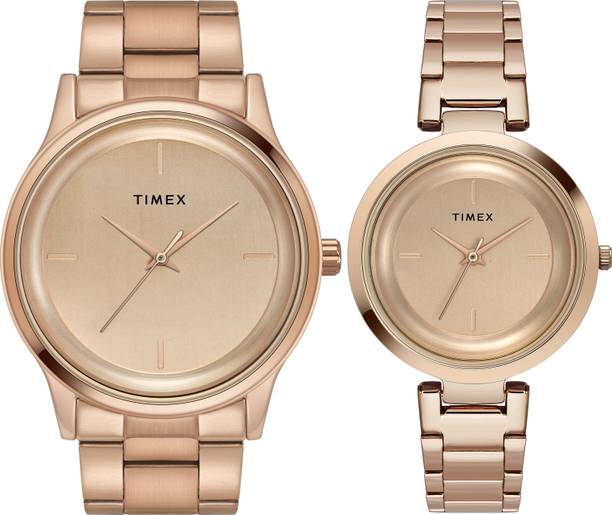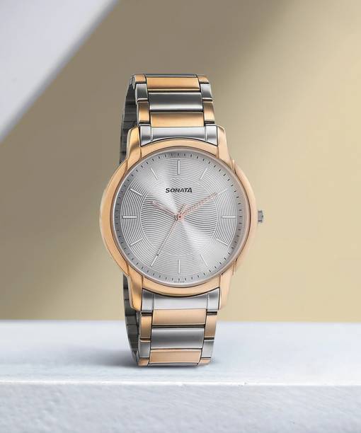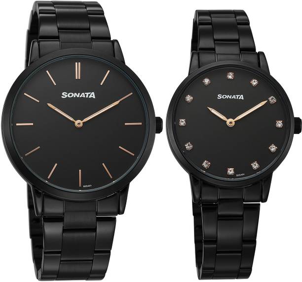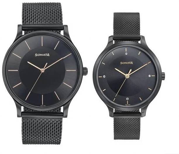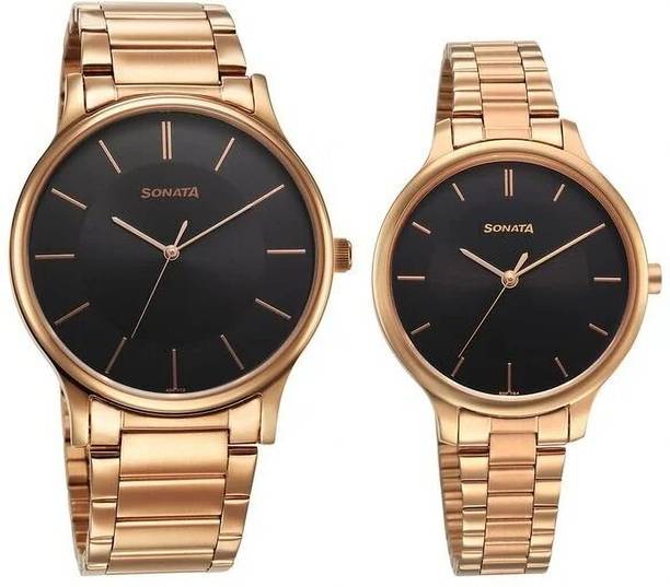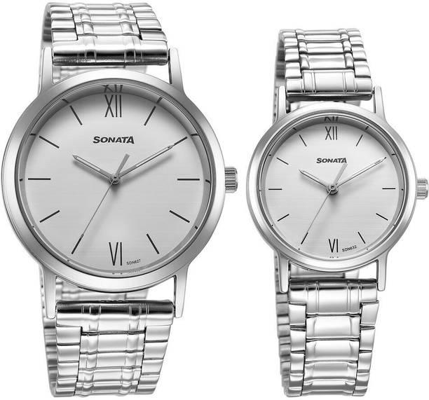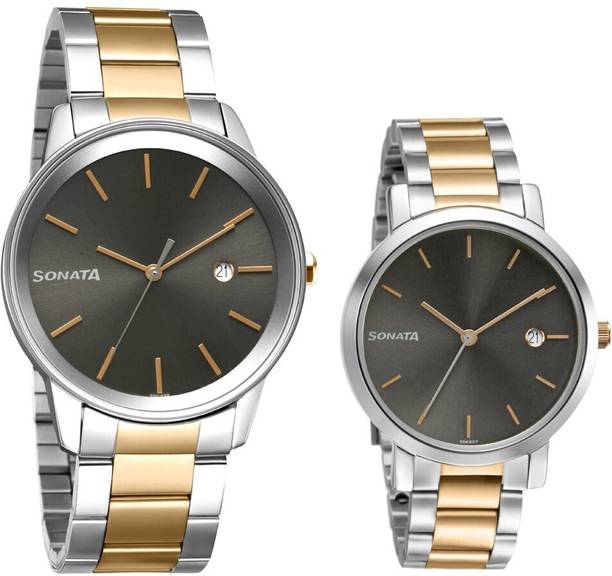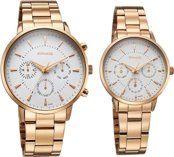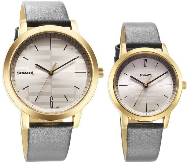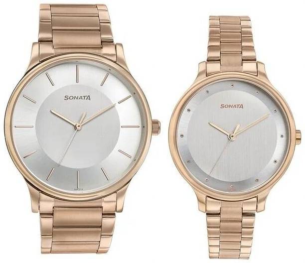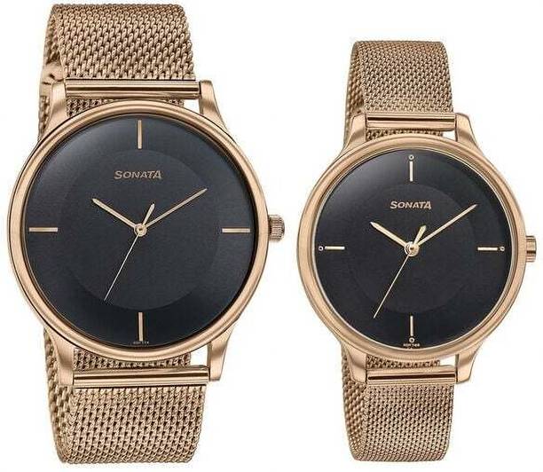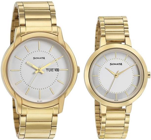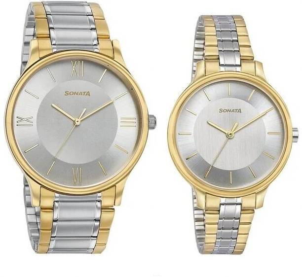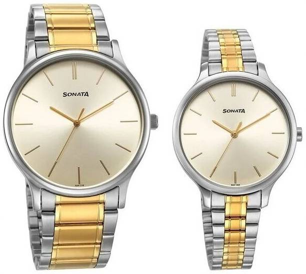 If you are looking for something more designer you can go for Sonata couple watches that have a more ornamented look. The Sonata 770038063BM01C is an analog model where the men’s watch comes in an elegant white rectangle dial with a sleek muted gold rim and a gold and silver flat woven bracelet strap. The women’s watch is super designer in its look with a diamond-shaped white dial and a muted golden border rim. The strap is designed in the form of a stone studded bracelet that is super chic and stylish to look at.