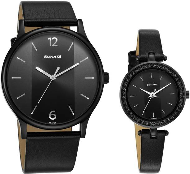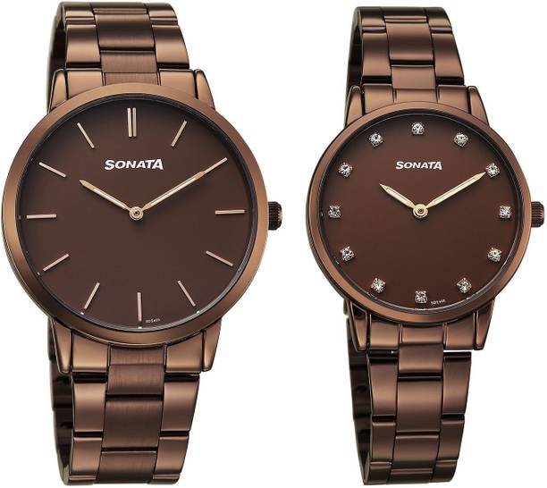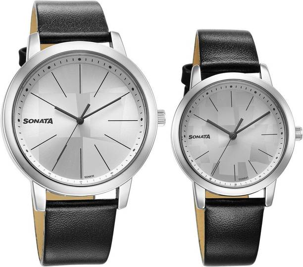 In addition to the metal strapped Sonata watches you can also get genuine leather strapped sonata couple watches online. These are stylish pairs of watches that are available in shiny brown color straps. The men’s watch will be having a broader strap as compared to the women’s watch and is more slender in its dimensions. The dials for both the watches will be white in color with an analog display and a stylish black and gold border rim.