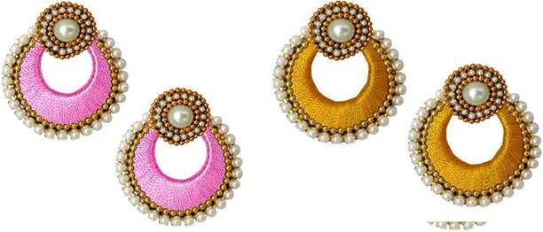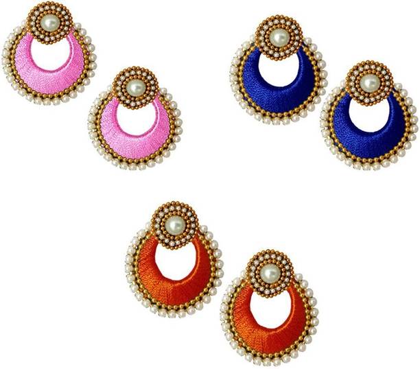 Silk thread earrings for women are also available in attractive color combinations for a more interesting look. You can wear these with dual colored salwars, according to the colors that match. You have earrings with striped designs as well as earrings with one color on the top and another at the bottom.