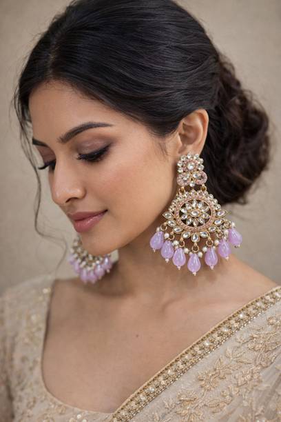 Drop earrings can add elegance to your ensembles. Drop earrings generally have a long body with a pearl-drop hanging from the bottom. Drop earrings can also come with a central stud, a long thread and tiny stone or pearl at the end. These earrings add grace to your sarees.