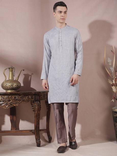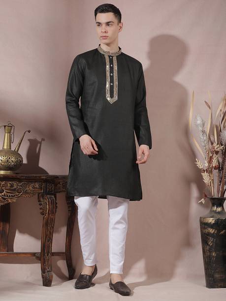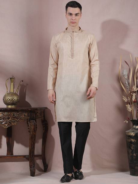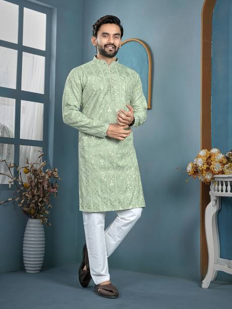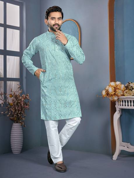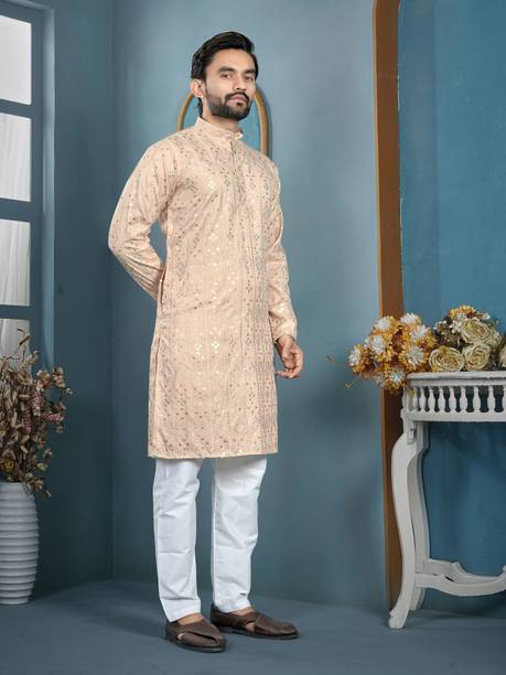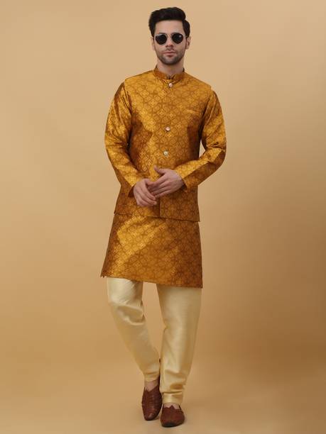 Kurta pajama is a quintessential ethnic attire for Indian men. Especially, kurta pajamas for weddings are a popular choice as a traditional garment suitable for any auspicious occasion. These festive garments are constructed with high-quality fabrics like pure silk, jute silk, and Banarasi silk in various colours and designs to give them a luxurious look. You can choose from a variety of embellished, embroidered, printed, striped, woven, textured, and self-design styles used to dress them up. Appealing designs like floral prints, paisley, tribal prints, graphic prints, and polka dots provide you with a wide array of options. You can opt for a plain, minimalistic variant to create a simple yet alluring look. If you want a more elaborate-looking option, you can choose the kurtas that come with a waistcoat or a Nehru jacket. These coats provide a structured look and feature beautiful designs and prints, making them suitable for men's wedding attire. You can also opt for wedding kurta pajamas with intricate designs and patterns in the yoke region to give a contemporary and fashionable twist to your ethnic attire. You can find stylish and versatile sherwani options from brands such as Manyavar, Hangup, Dolphin Miles, Benstoke, and SG Rajasahab. You can shop for men's kurta pyjamas for weddings online across e-stores. The information you are reading has been last updated on 22-Jan-26.