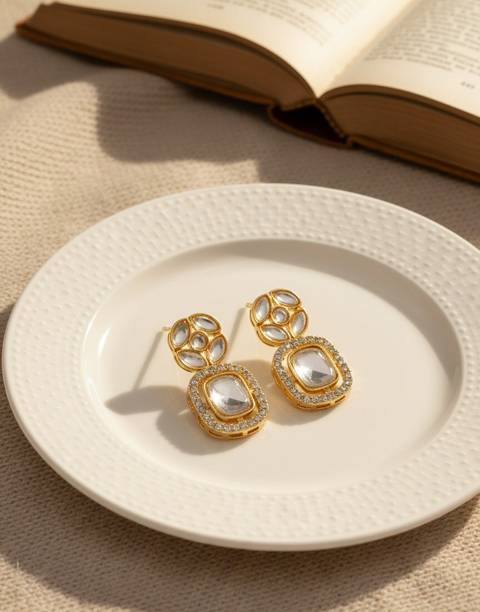 Simple stud earrings with statement white stones on them are the perfect everyday wear. Incorporate these white stone earrings into your 9-to-5 looks to hype up their elegance. Layered earrings with white stones on them are appropriate for days when you want to add some drama to your outfit without going overboard. Gold-plated drop earrings which are minimal in design pull you in with their understated yet opulent charm - flaunt them with crisp white shirts or with neutral-hued outfits.